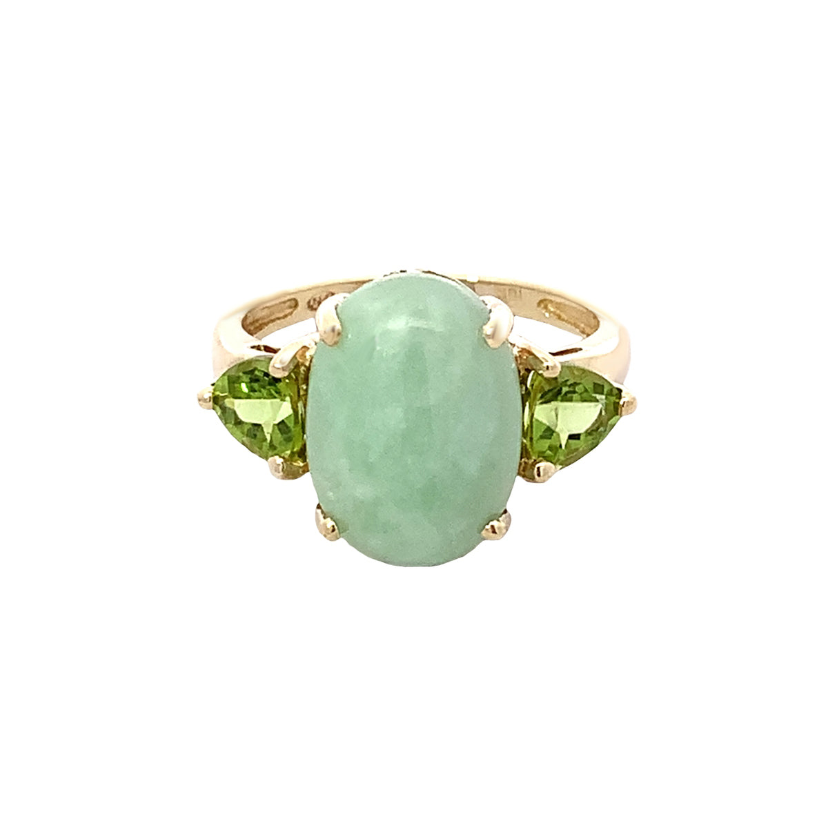 14kt yellow gold Vintage oval jade ring with trillion peridots, size 7