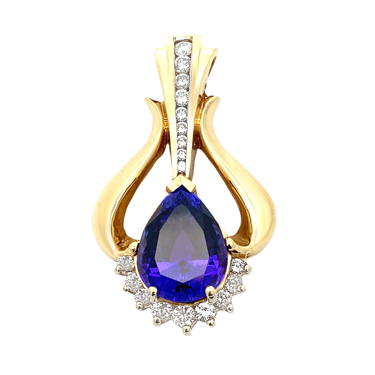 Large 14k yellow gold Vintage teardrop pendant with 9.32ct pear tanzanite & 0.85ct diamonds