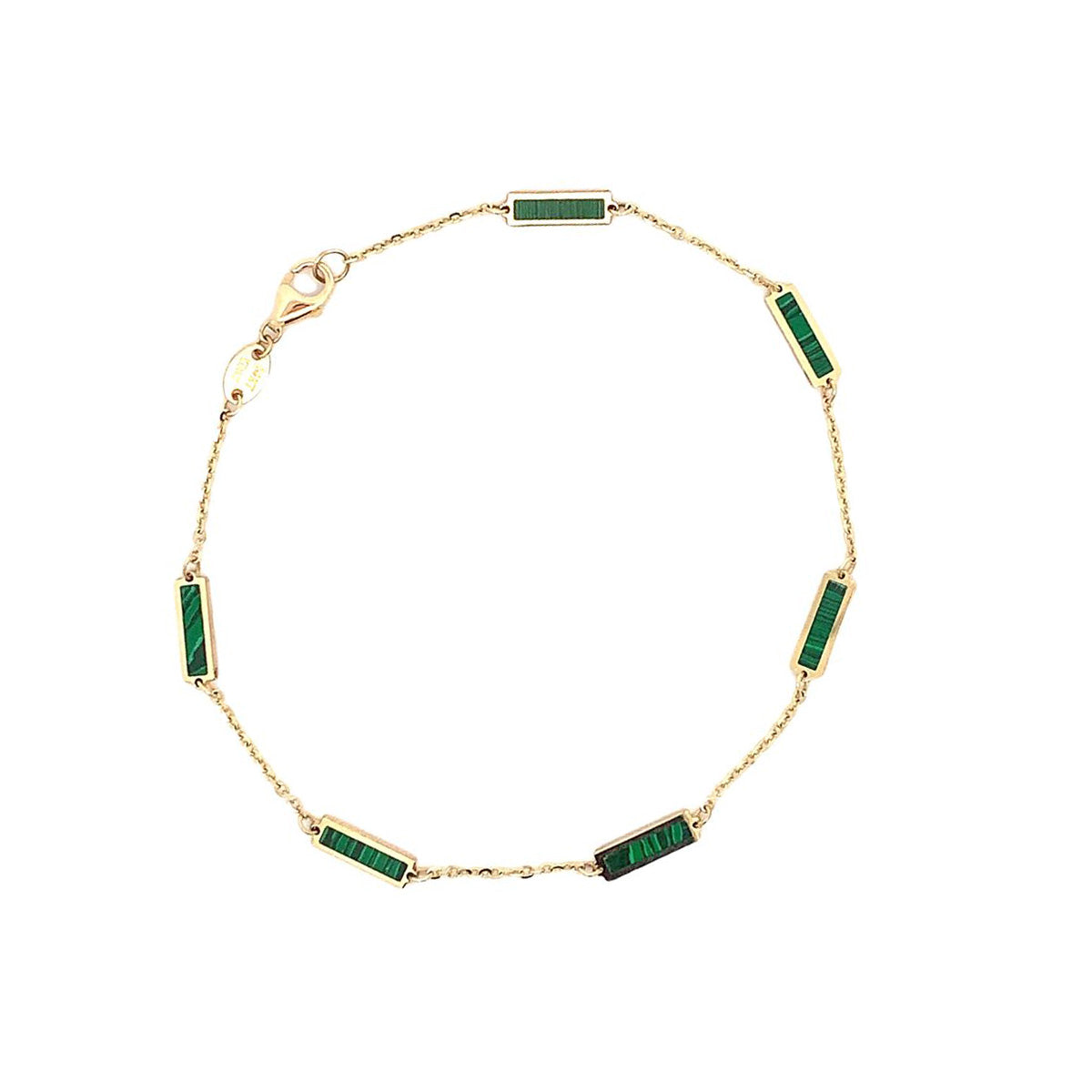 14k yellow gold bracelet with 6 narrow inlaid malachite bar stations