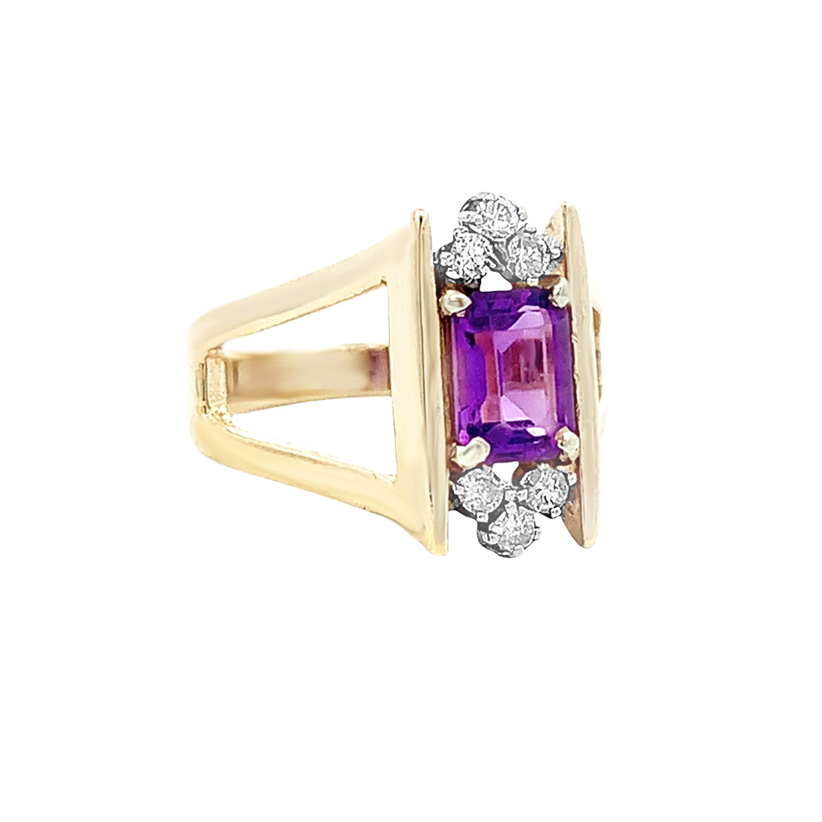14kt yellow gold Vintage Modernist amethyst & 0.15ct diamond ring, size 6.25