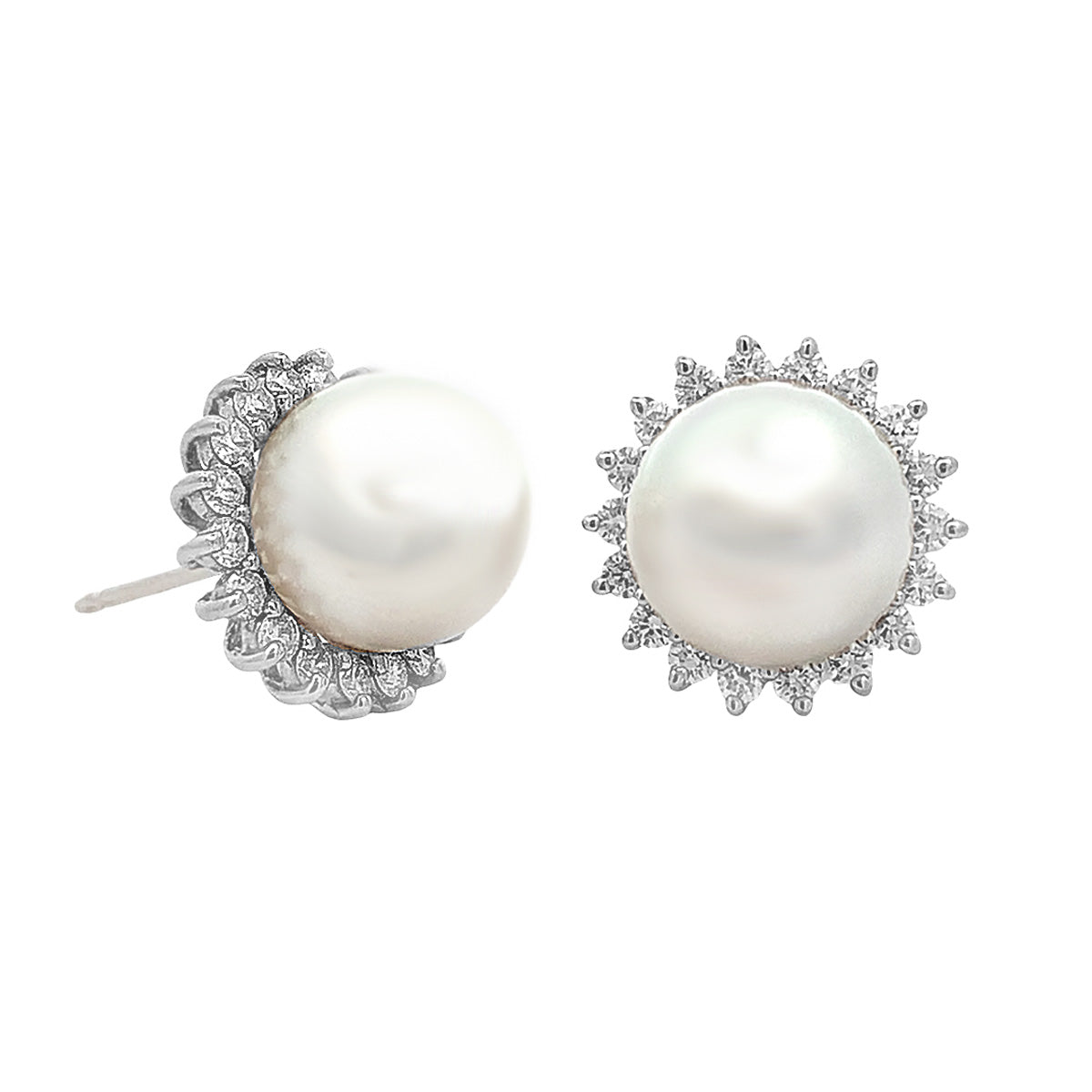 14kt white gold 10.7mm South Sea pearl & 1.10ct diamond halo stud earrings