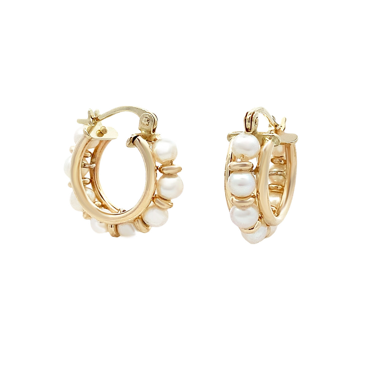 14k yellow gold 5/8" small Vintage pearl hoop earrings. A fashionable alternative to classic pearl studs!
