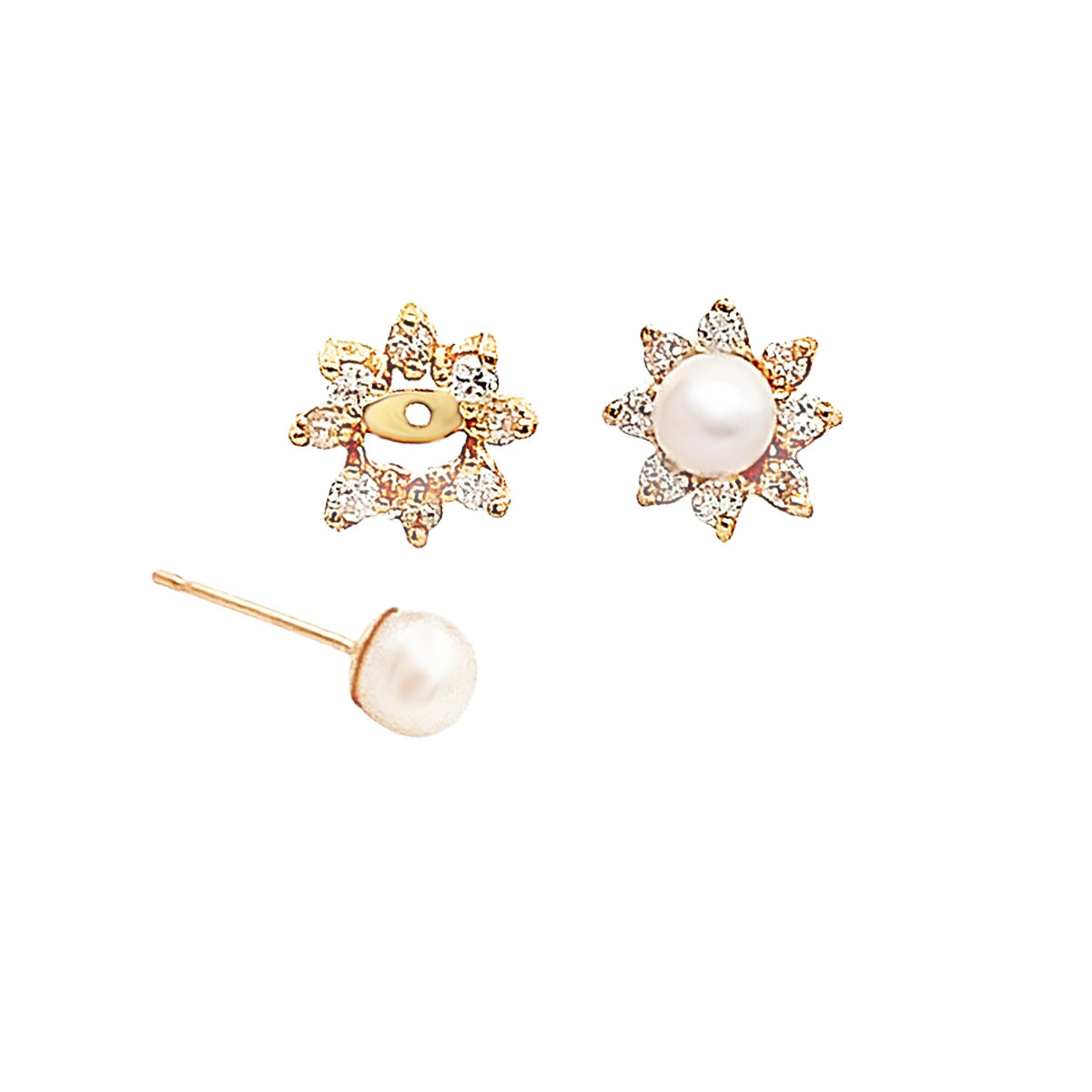 14kt yellow gold small Vintage cultured Akoya pearl stud earrings with removable 0.40ct diamond jackets. Classic 5mm pearl studs can be worn alone.
