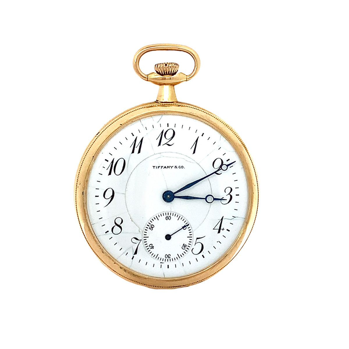 Classic 18k yellow gold Vintage Tiffany / Waltham 15-jewel pocket watch with rear monogram, circa 1918. Our expert watchmaker has cleaned and restored the movement. A beautiful and lasting gift for someone special.
