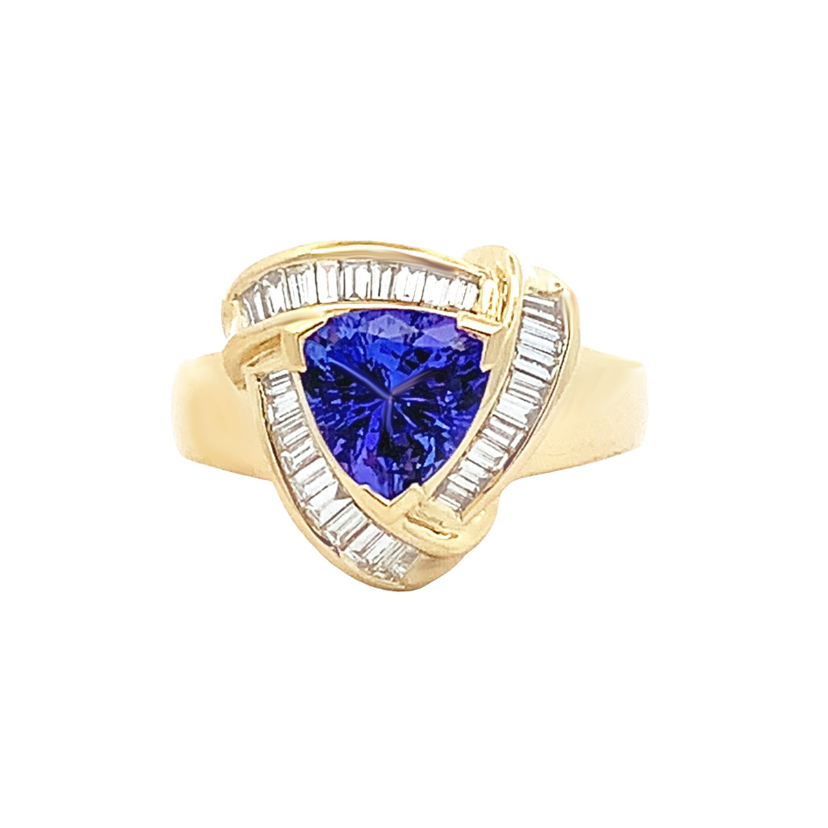 18k yellow gold Vintage trillian tanzanite & 0.81ct baguette diamond ring, size 7