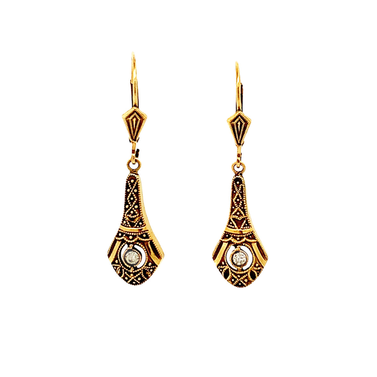 14kt yellow gold delicate Vintage drop earrings with granulated texture & crystals