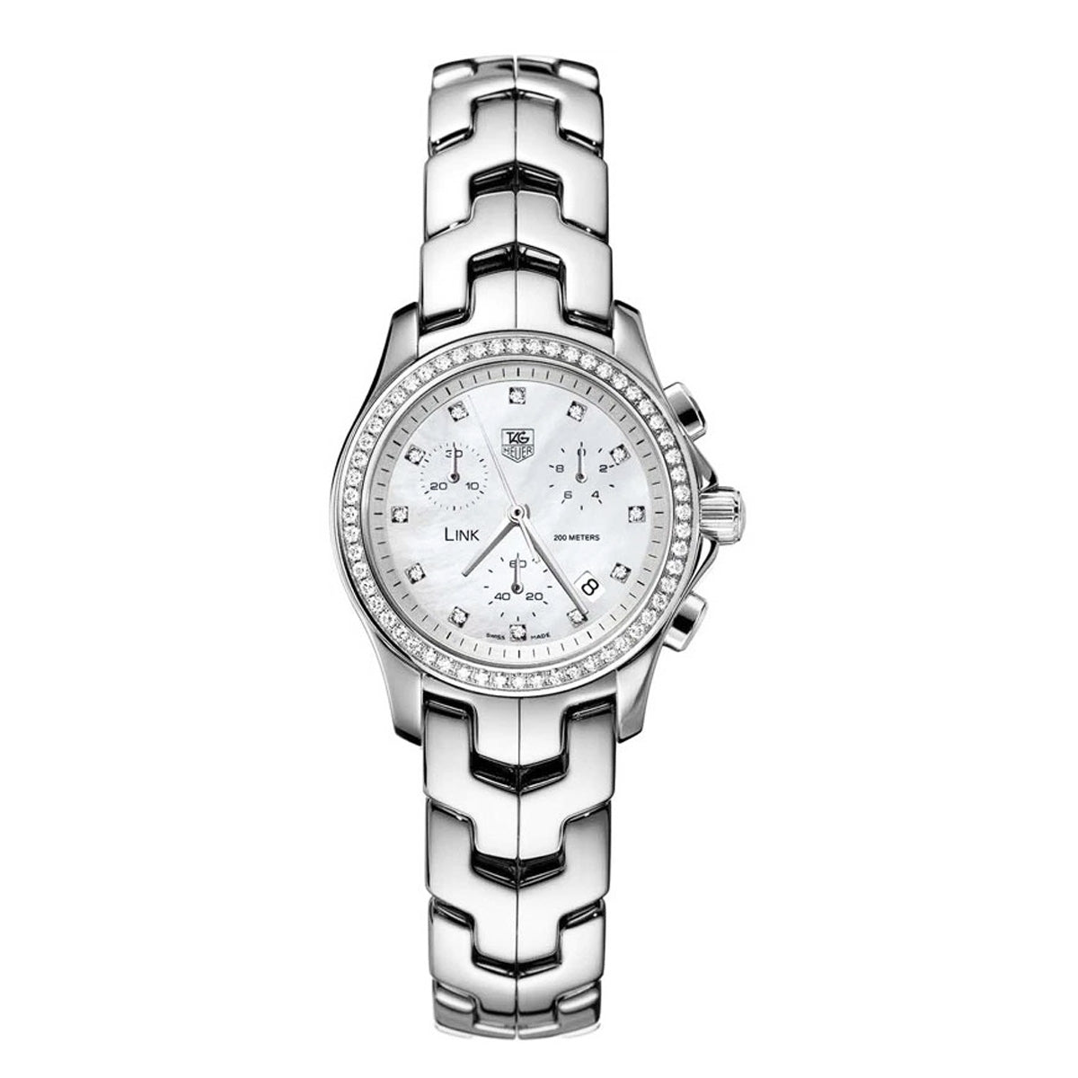 Vintage steel 34mm Tag-Heuer "LINK" quartz watch with diamond bezel & pearl/diamond dial