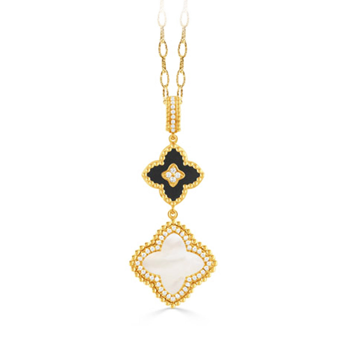 Stylish 18k yellow gold 18" onyx & mother-of-pearl double quatrefoil pendant with 0.20ct diamonds by Doves
