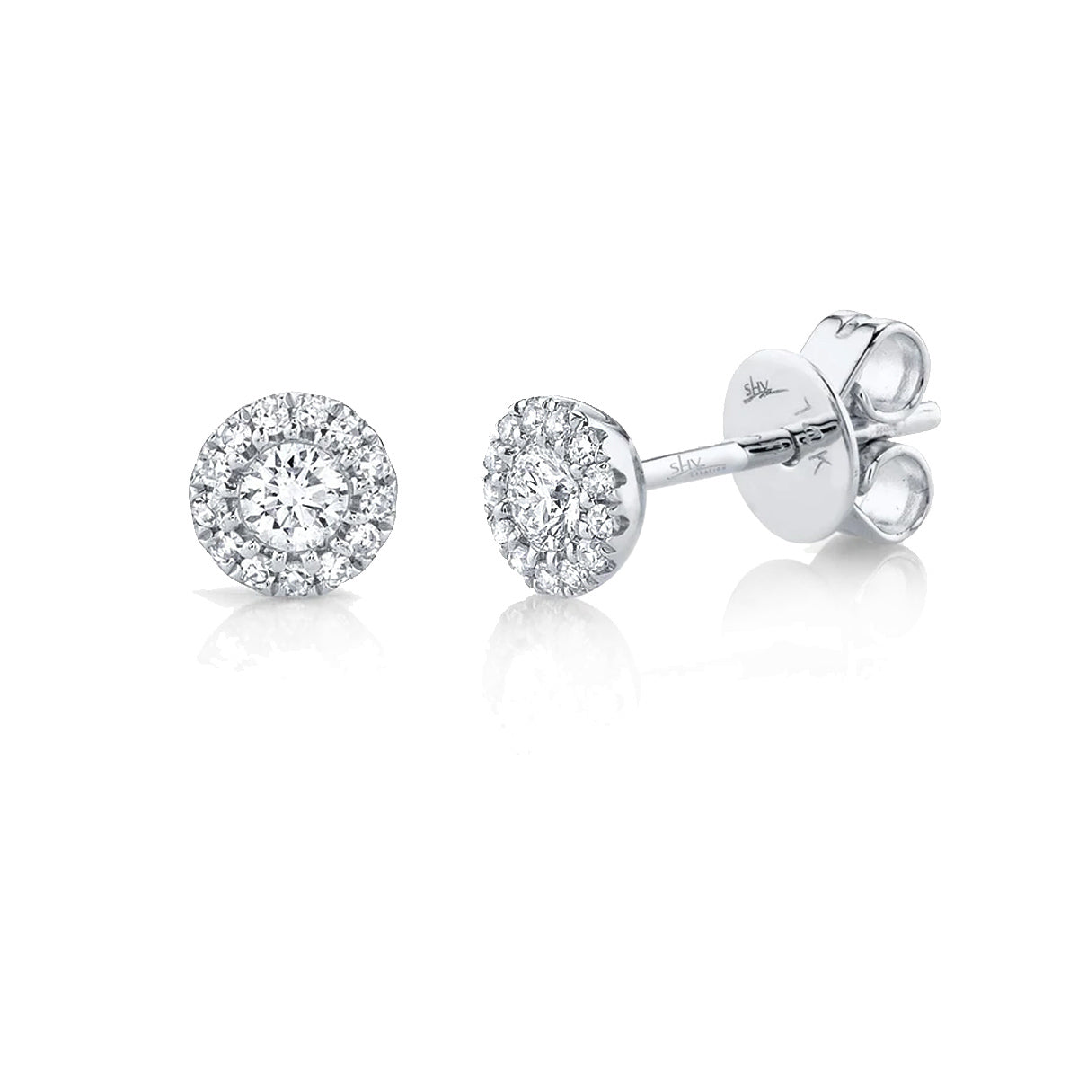 14k white gold tiny 0.24ct diamond halo stud earrings by Shy Creation