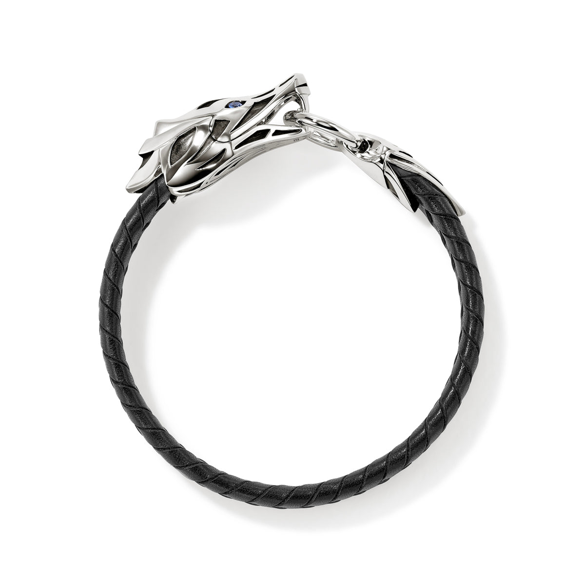 Sterling silver John Hardy men's "Naga" dragon head woven black leather bracelet with sapphire eyes