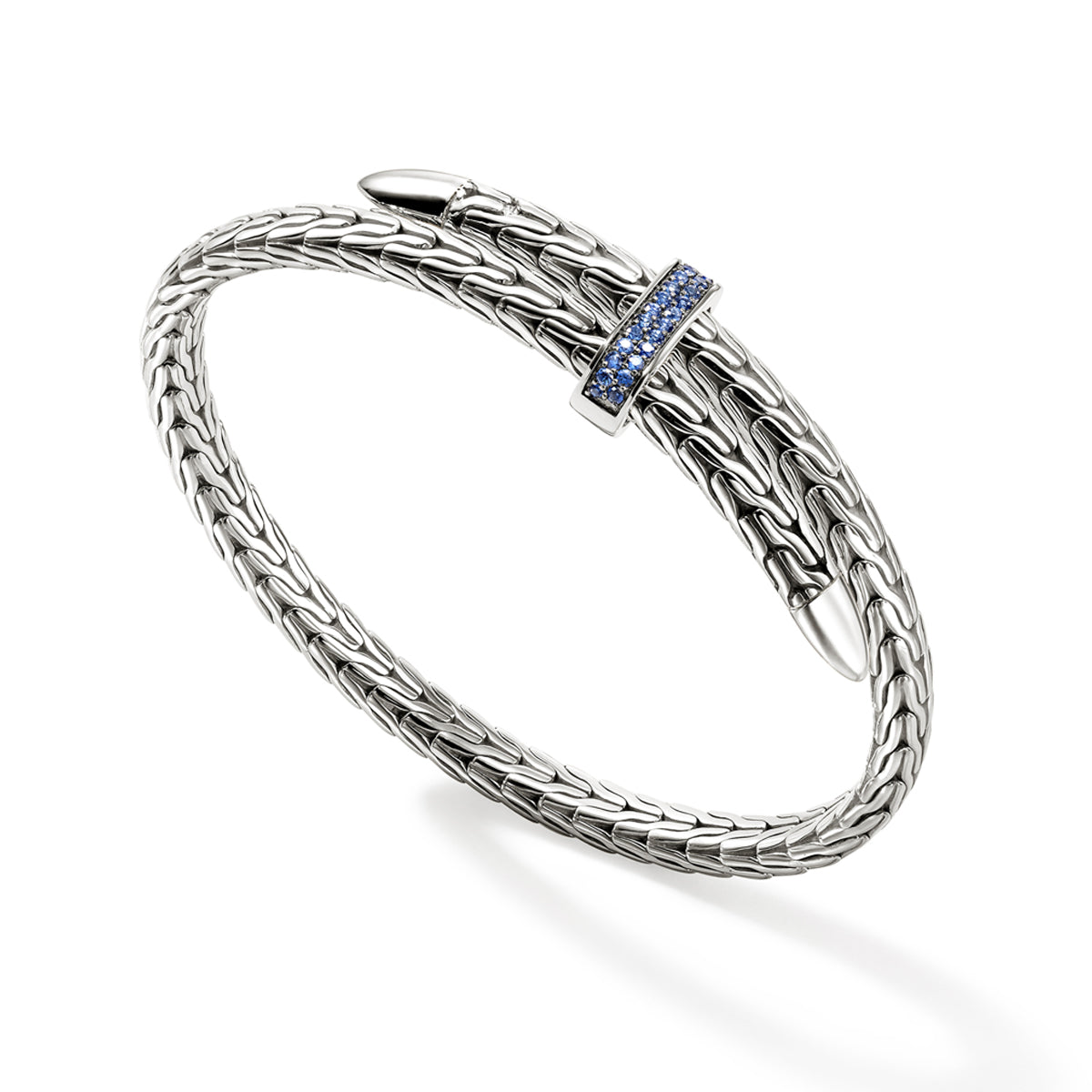 Sterling silver John Hardy "Spear" flex bypass cuff with pave blue sapphire center