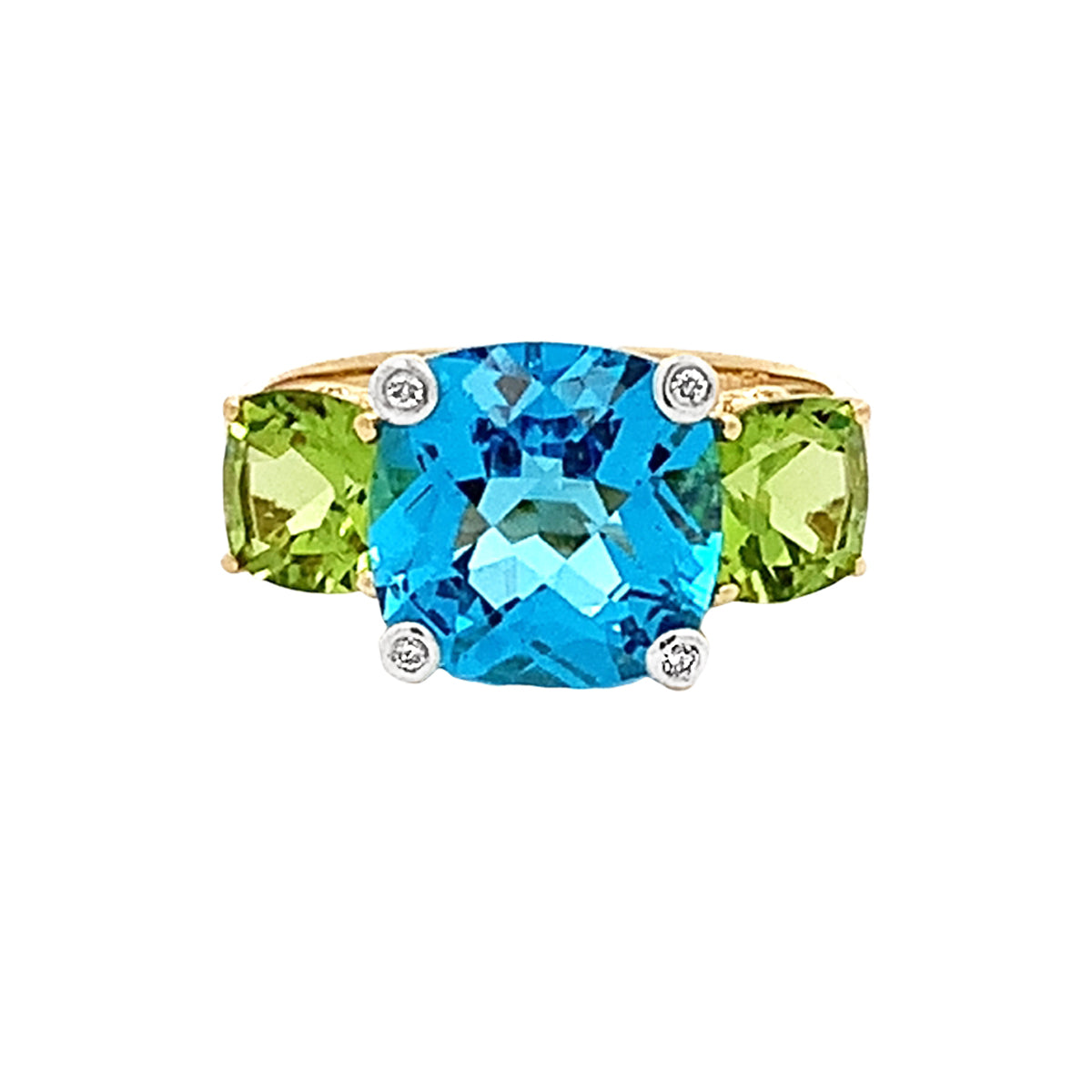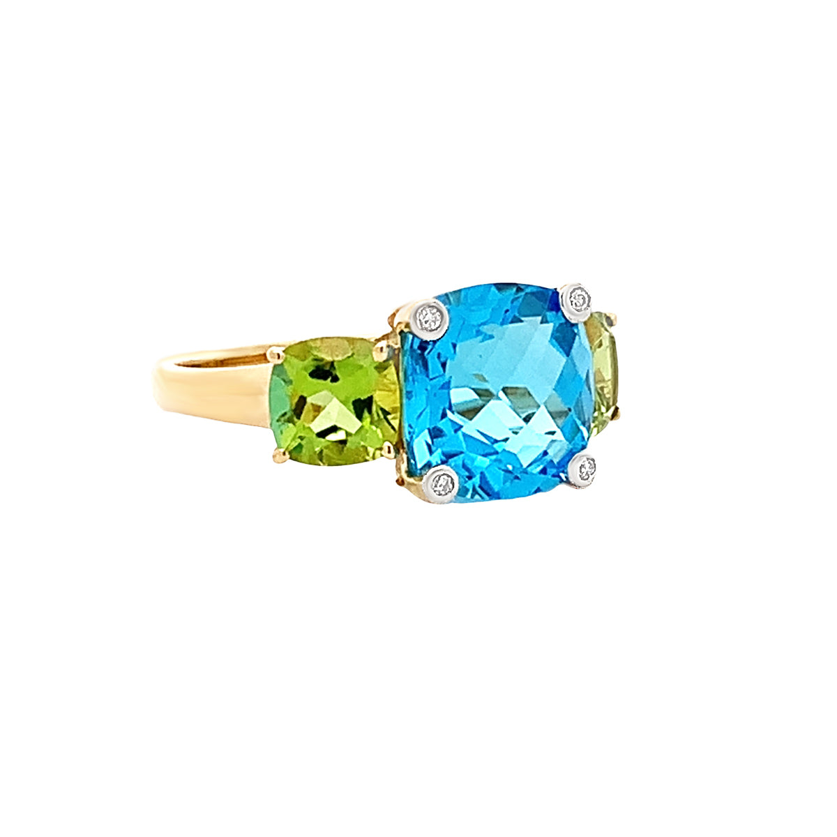 14kt yellow gold Vintage cushion-cut blue topaz & peridot 3-stone ring with diamond prongs and flower design on the side. Finger size 7.