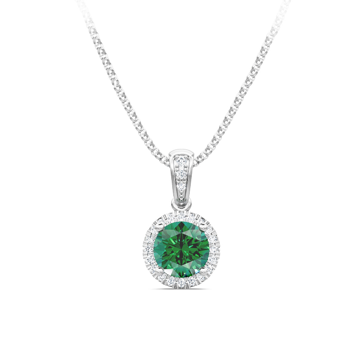 14kt white gold 18" 5mm round emerald & 0.10ct diamond halo pendant. For the green gemstone lover, or to commemorate a May birthday.