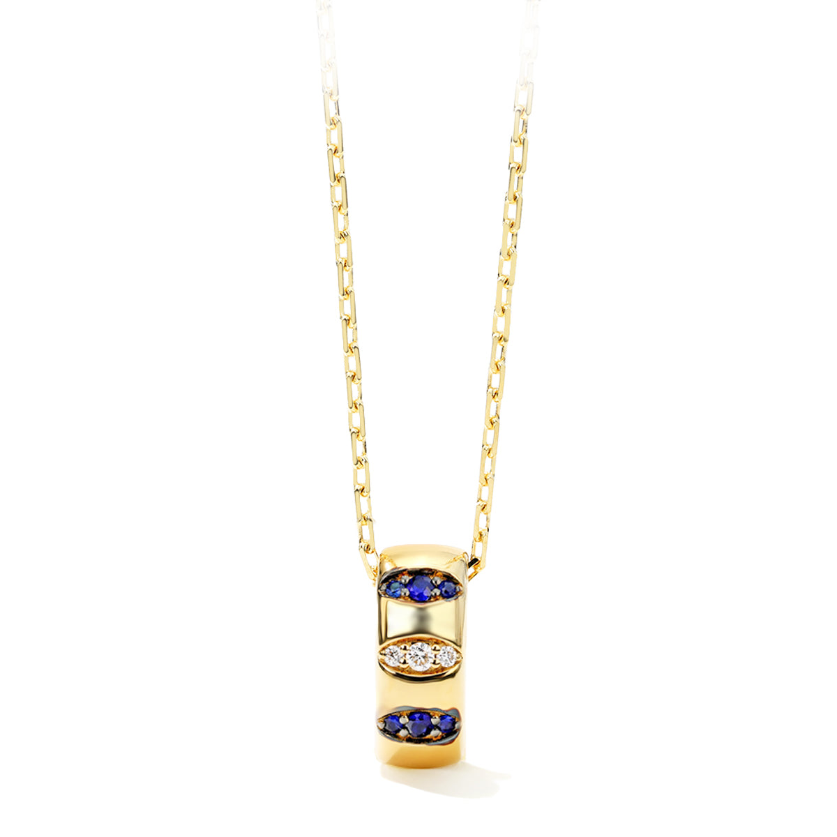18k yellow gold 18" sleek "Guardian" barrel pendant by Mark Henry with sapphires & 0.03ct diamond cluster stripes