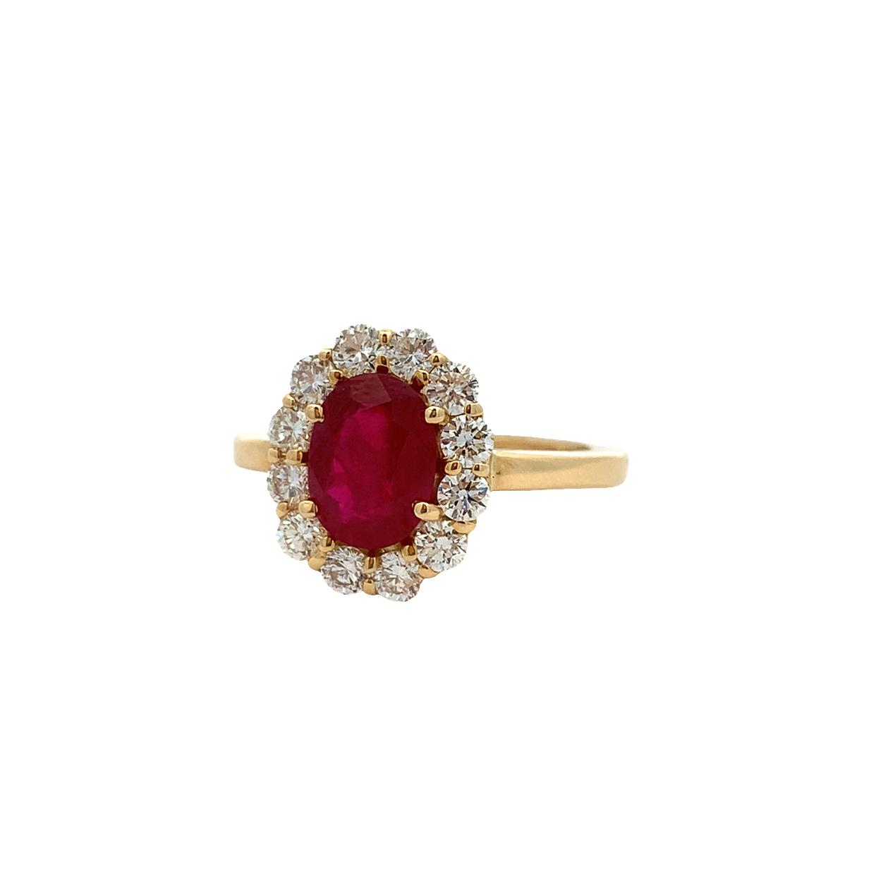 18ky Gold Ring 1.50ct Oval Ruby & 0.70ct Diamond Halo, Size 6