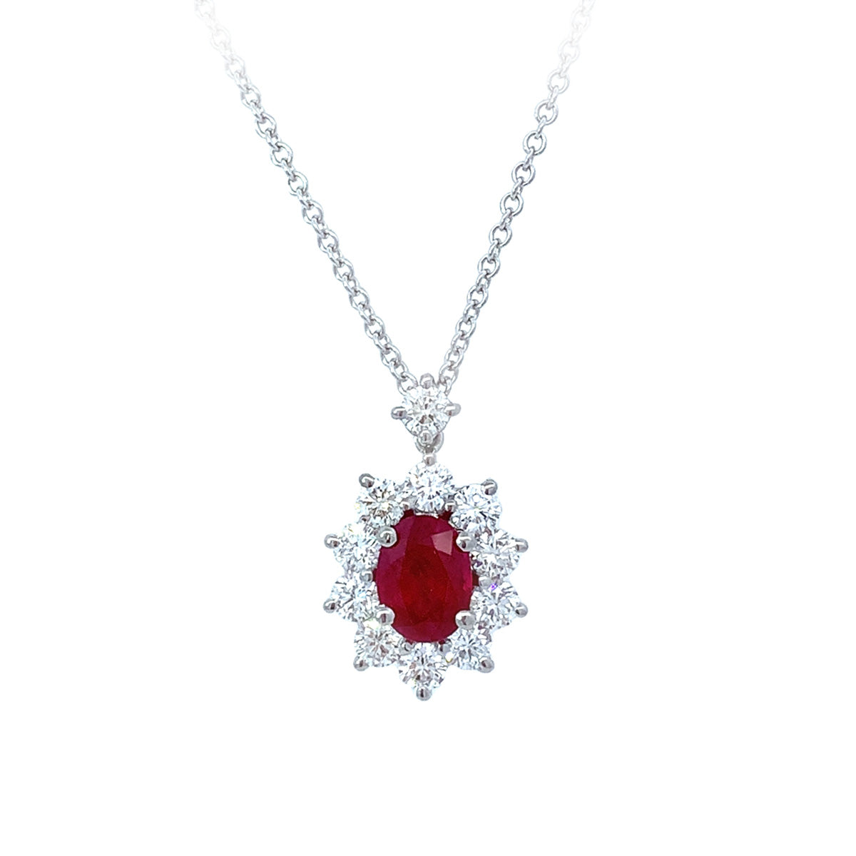 Platinum 1.80ct fine oval ruby pendant with 1.35ct diamond halo on 18kw gold 16" cable chain