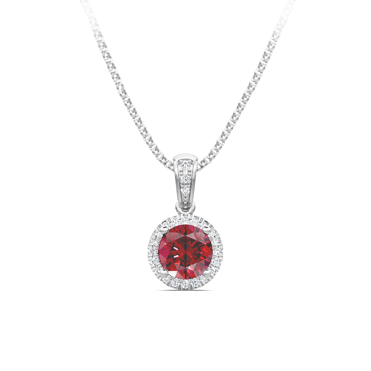 14kt white gold 18" 5mm round ruby & 0.10ct diamond halo pendant. For lovers of this royal red gemstone, or to commemorate a July birthday.
