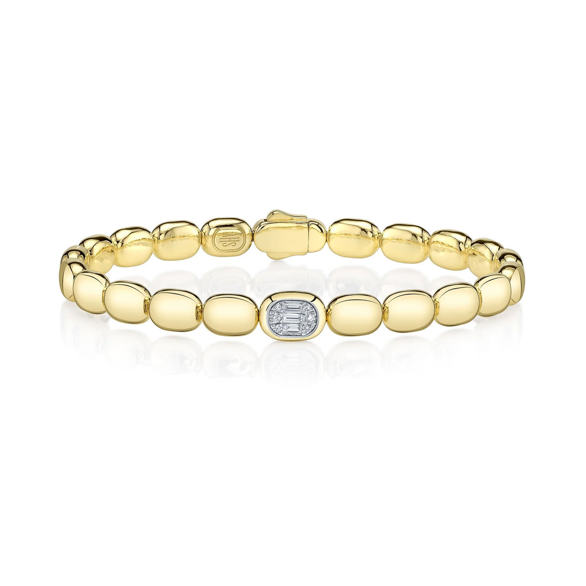 14k yellow shiny gold "Icon Lumeria" 0.10ct baguette & round diamond flex bangle by Shy Creation with gold pillow links and one diamond station