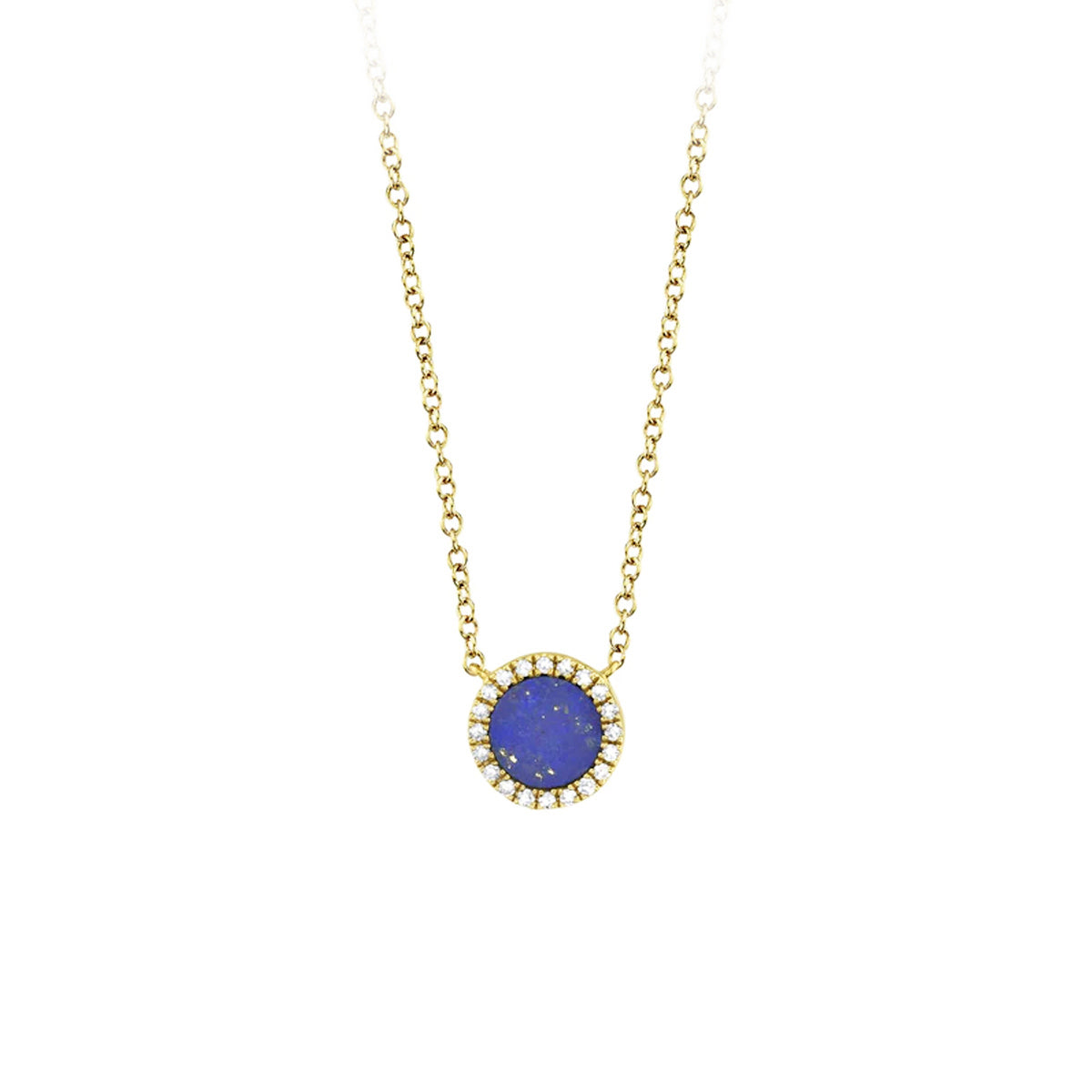 14k yellow gold 18" small round lapis and .04ct diamond halo necklace
