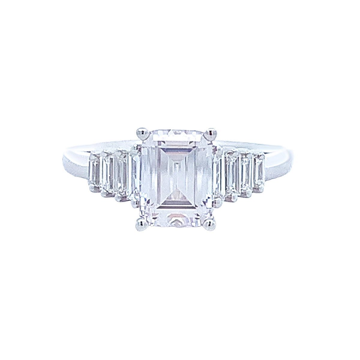 14k white gold engagement ring mounting with 0.42ct baguette diamond shank & 1.50ct emerald-cut center setting, size 6.5