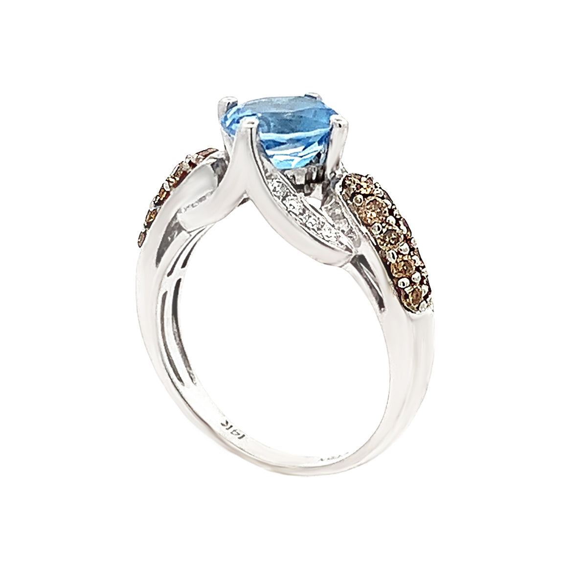 14kt white gold Vintage blue topaz & 0.35ct chocolate & white diamond ring by LeVian, size 5