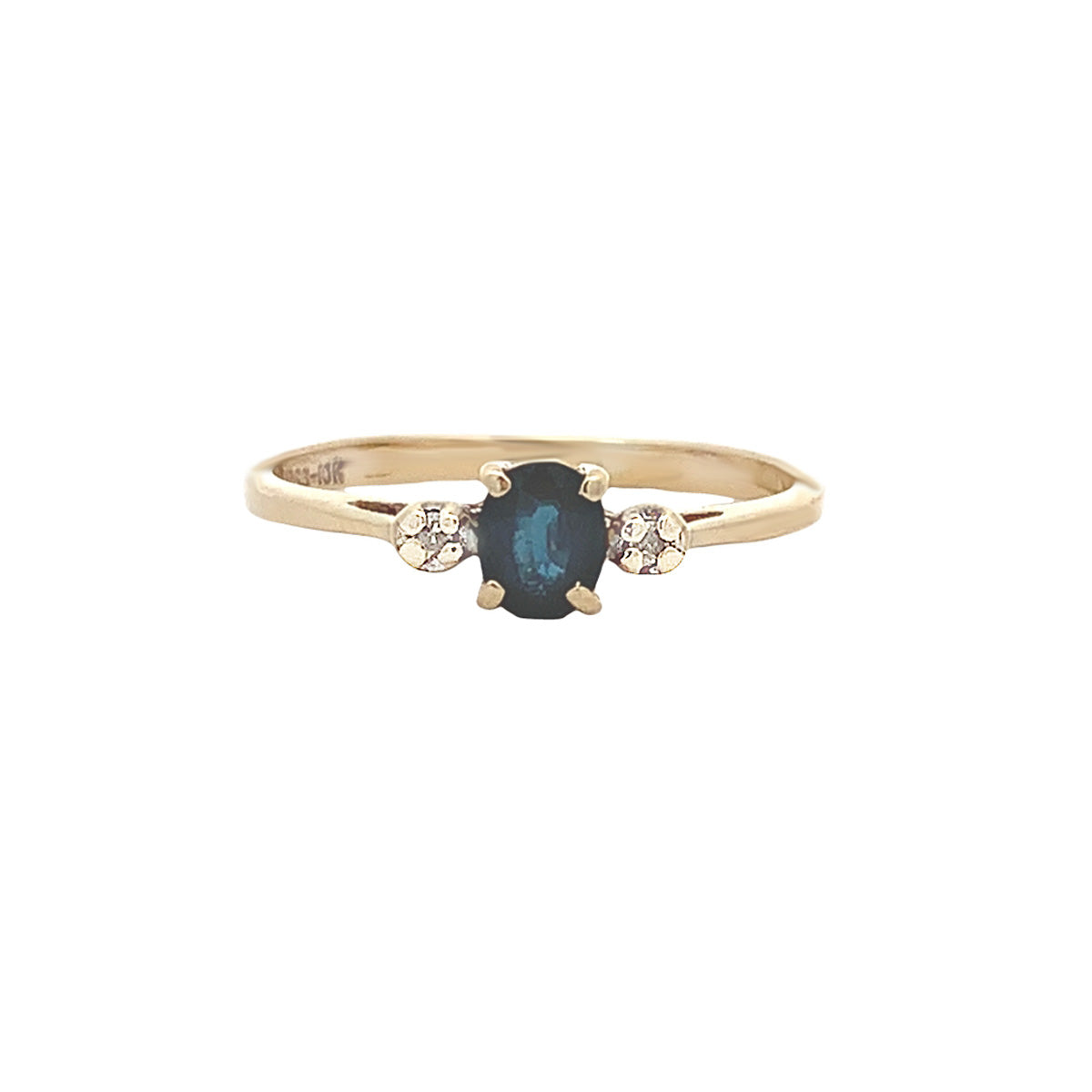 10kt yellow gold small 3-stone Vintage oval sapphire ring with small diamonds, size 7