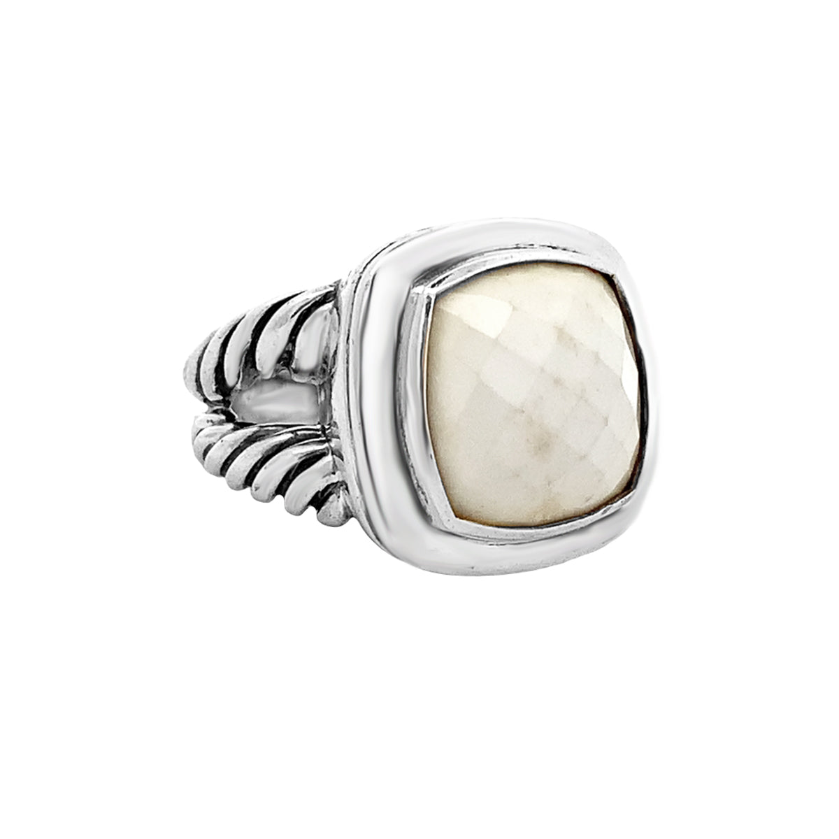Sterling silver David Yurman 14mm Vintage "Albion" faceted white agate ring, size 7