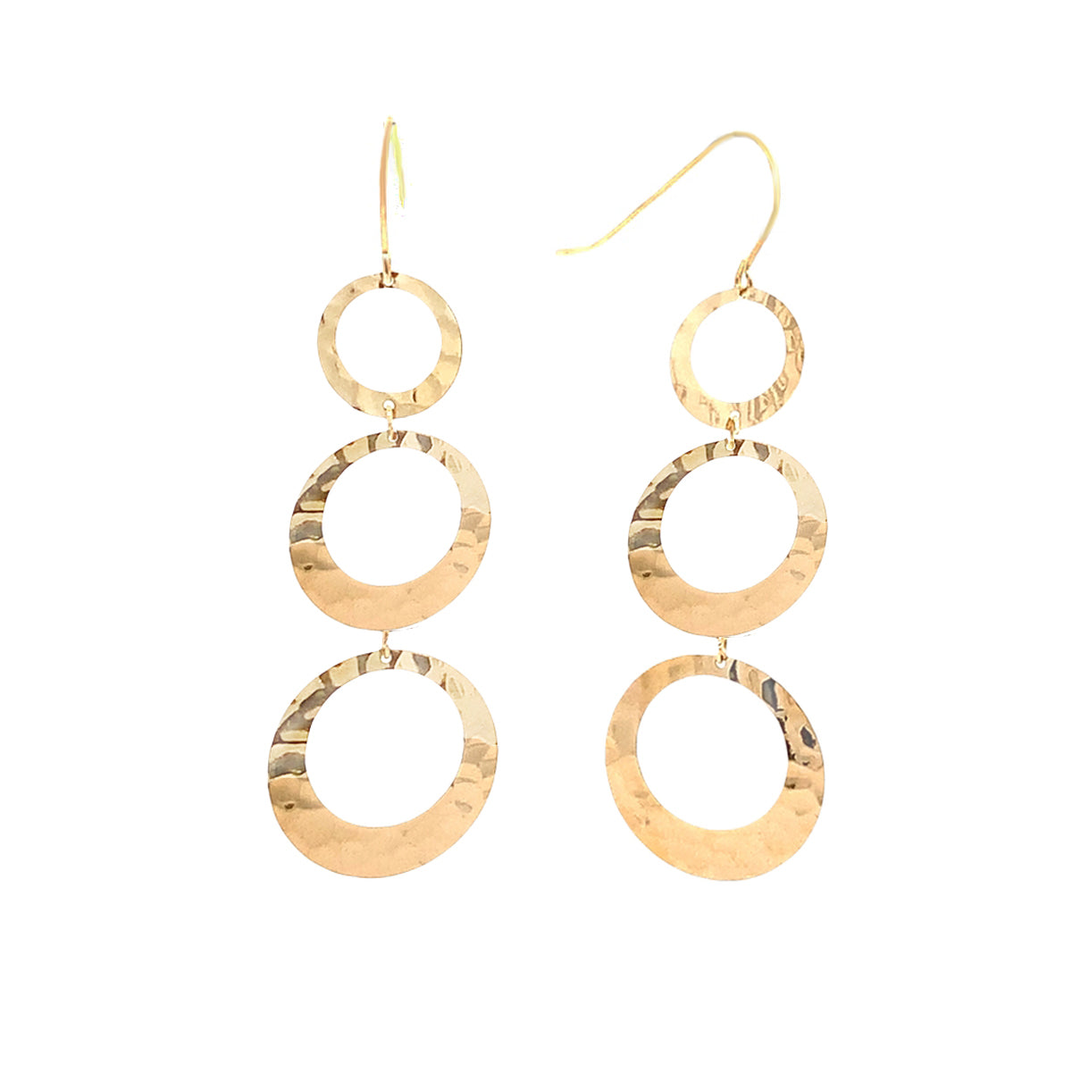 14kt yellow gold 2.25" long Vintage hammered 3-circle wire drops