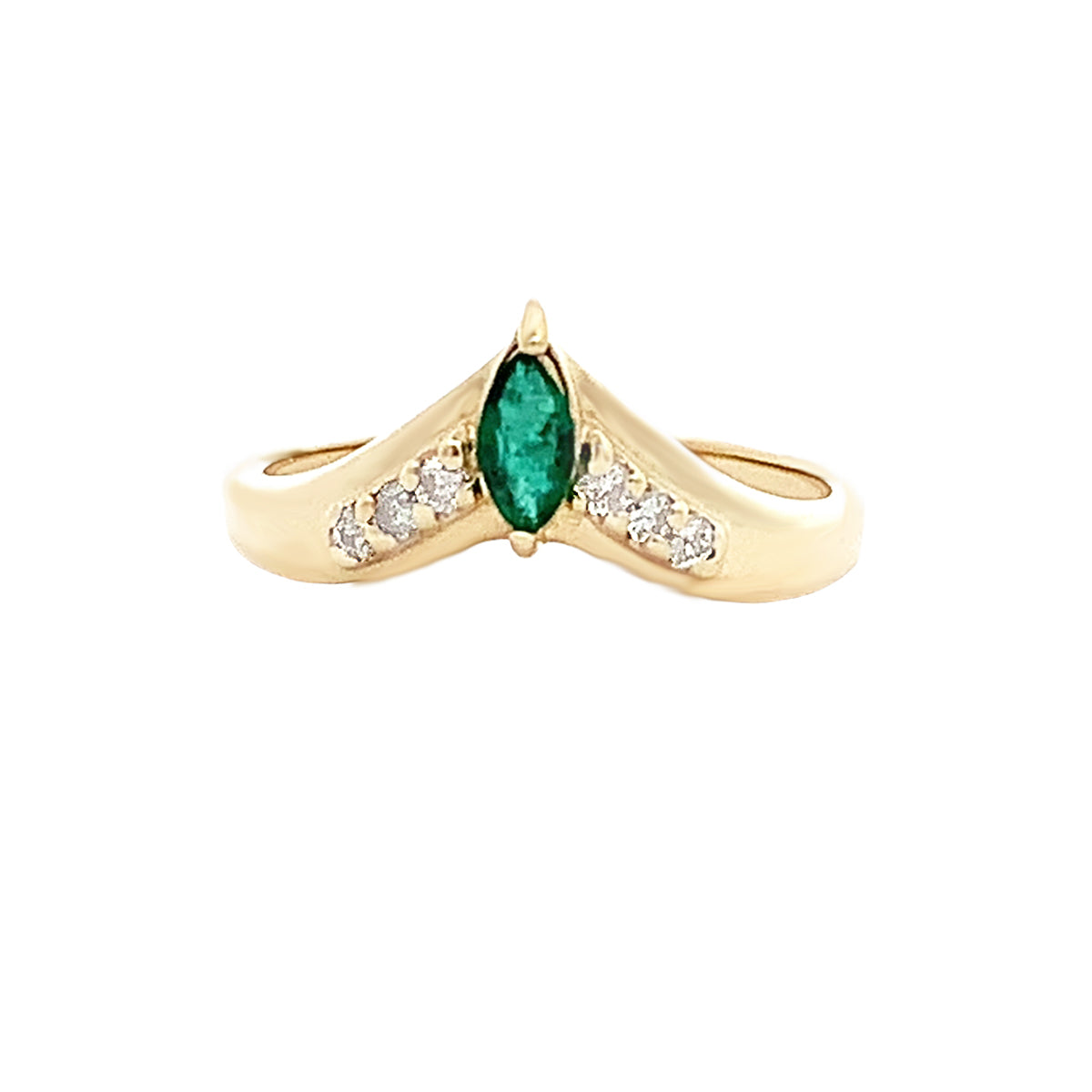 14kt yellow gold Vintage "V" ring with marquise emerald and 0.06ct diamonds, size 6
