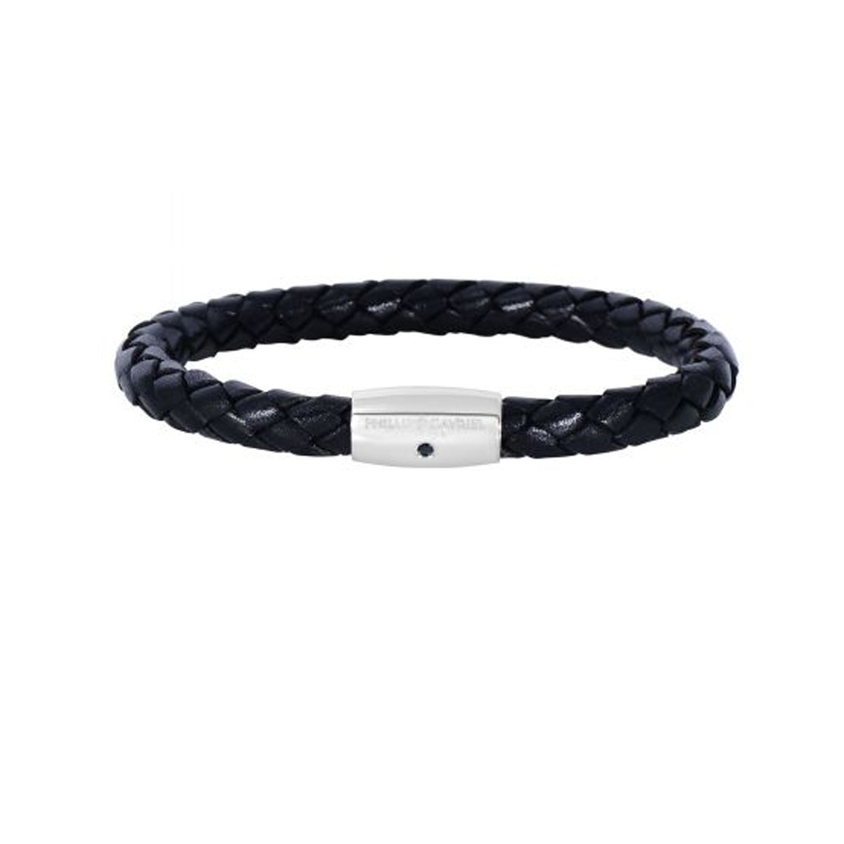 Men's 8" 4mm black woven leather bracelet with sapphire in sterling silver clasp
