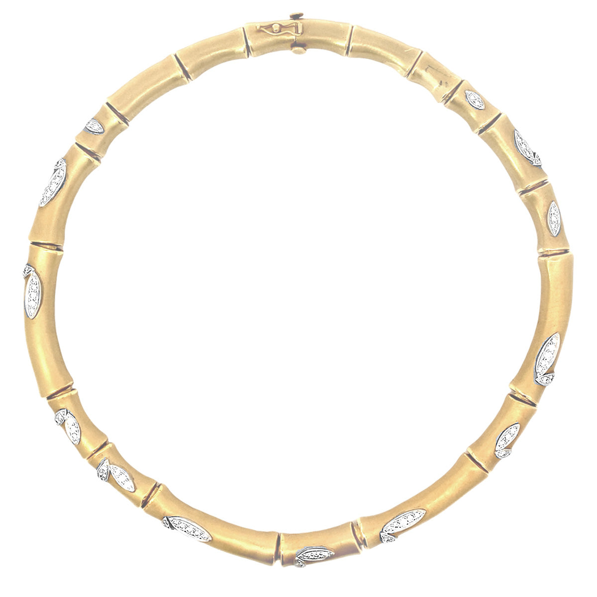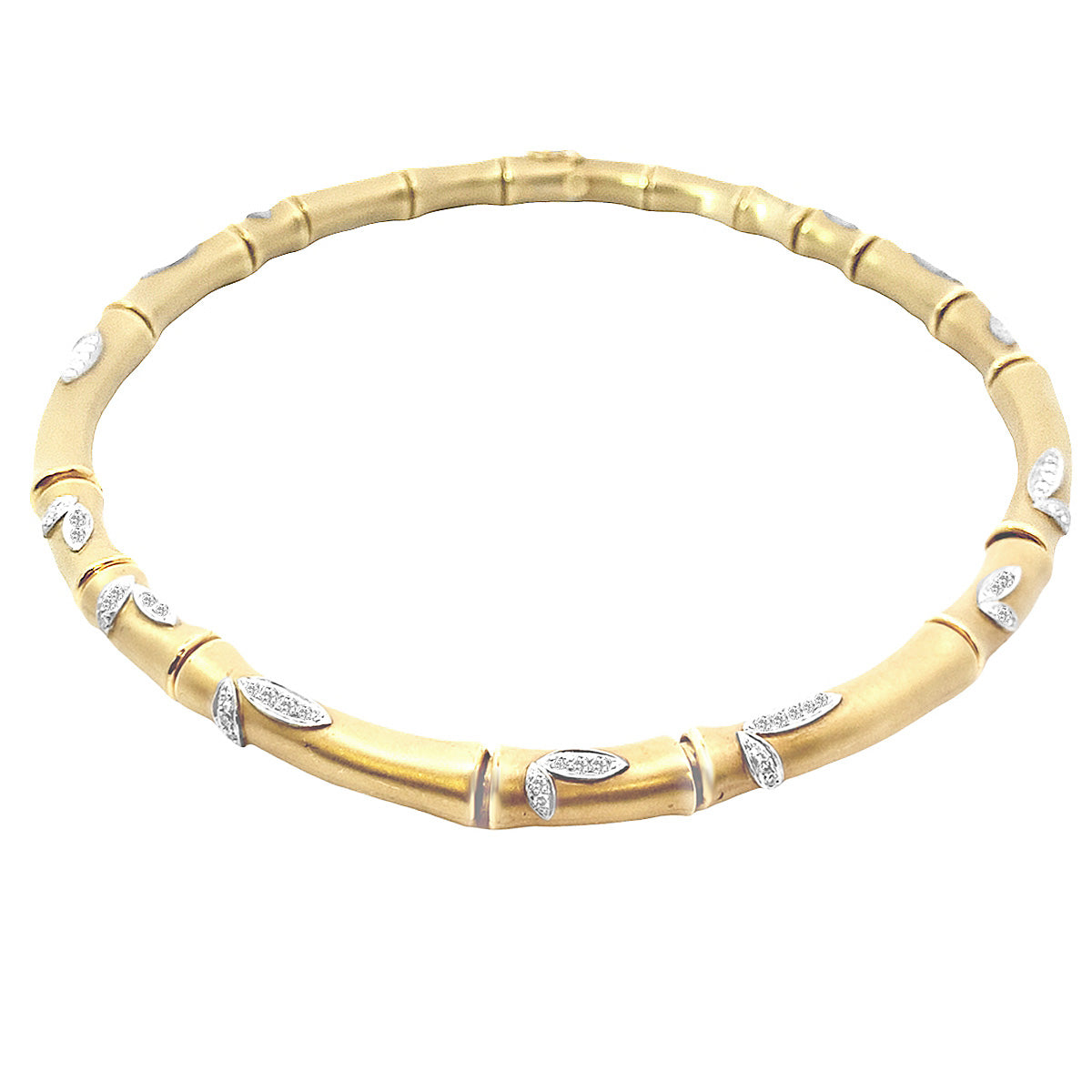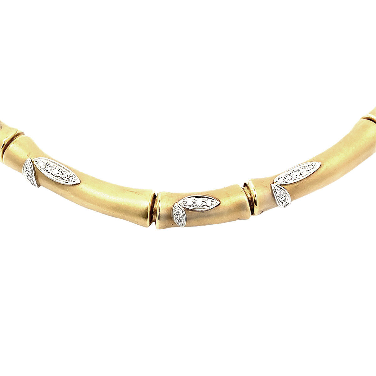 One-of-a-kind 18kt yellow gold 17.5" heavy Vintage "Bamboo" collar necklace with a subtle matte finish & 1.51ct diamonds set in platinum "leaves"