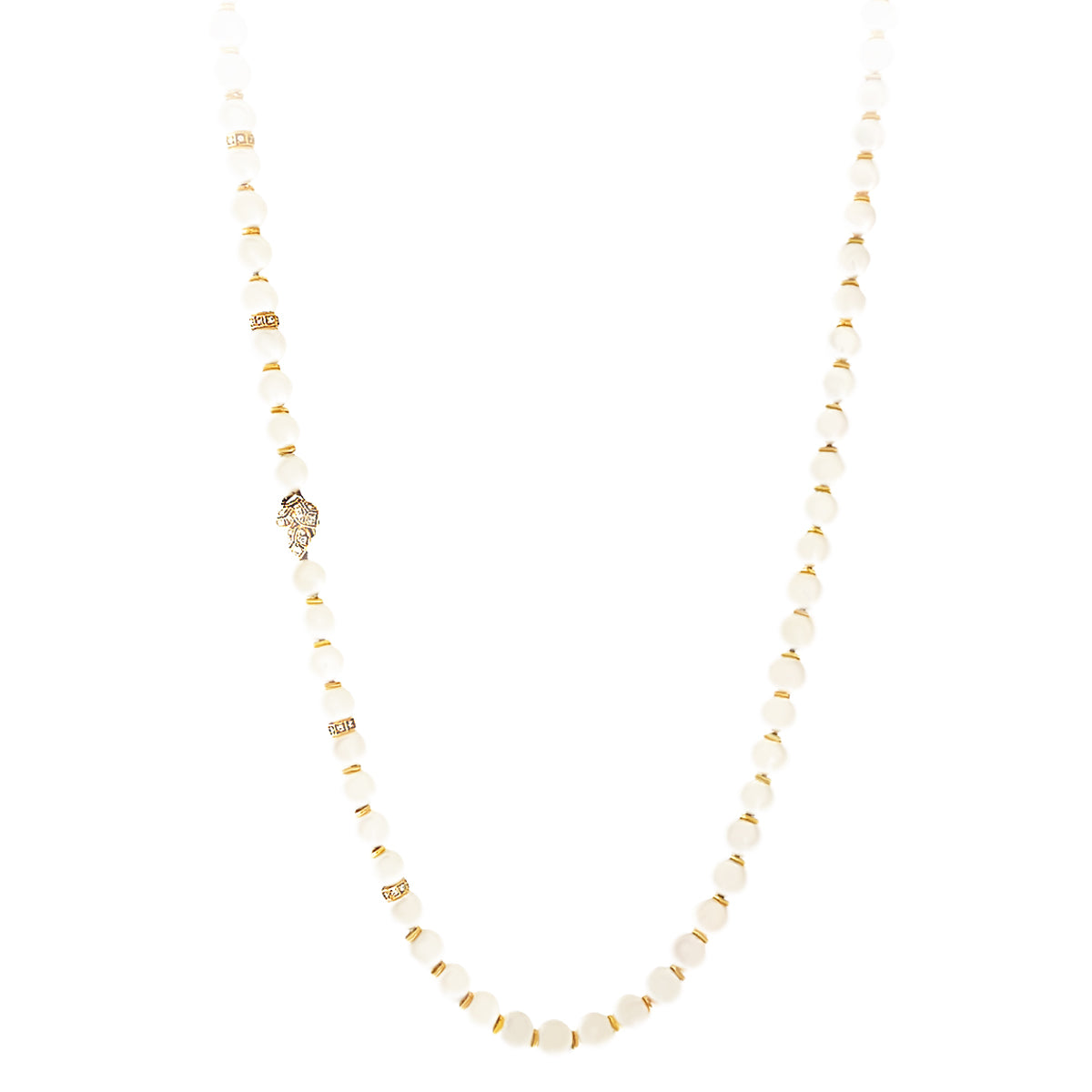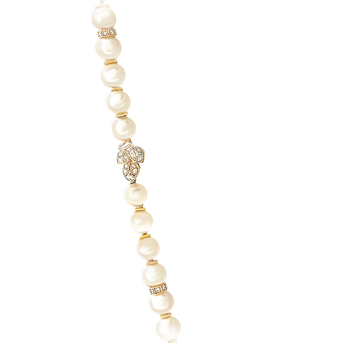 Beautiful Opera length 30" Vintage strand of 7-7.5mm Akoya cultured pearls with 14kt yellow gold 0.24ct diamond rondels & diamond leaf clasp
