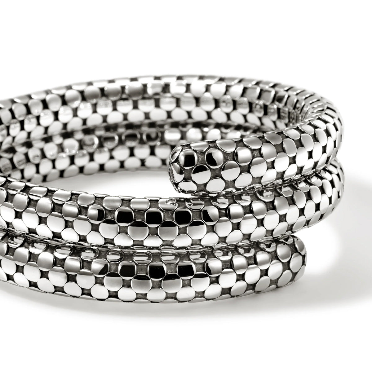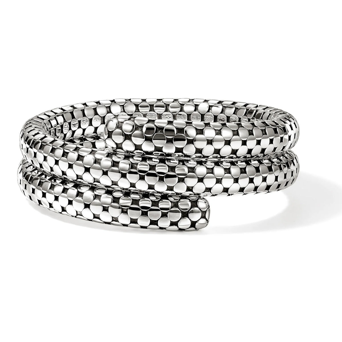 Sterling silver bold Vintage John Hardy "Dot" flexible coil bracelet. Canadian-born designer John Hardy settled in Bali and in 1975 he started his own jewelry company there, hiring local jewelers. John Hardy designs are deeply rooted in Balinese culture.