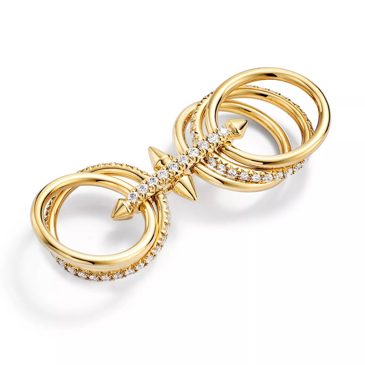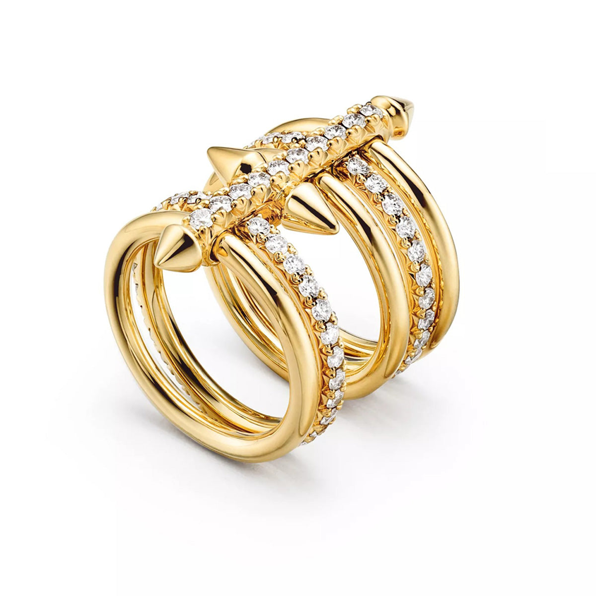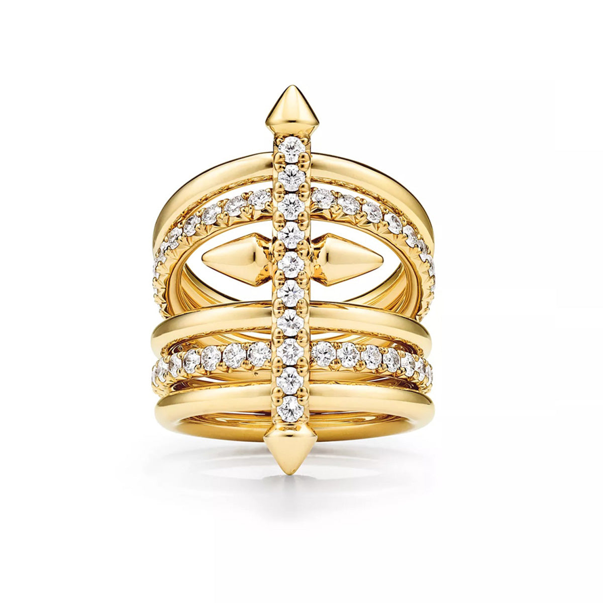 18kt yellow gold Vintage Tiffany "Titan" ring with 1.93ct diamonds, size 10 (no sizing). The Tiffany Titan collection by Pharrell Williams is inspired by the Greek god Poseidon’s trident. These rings are characterized by a spear-shaped motif with contoured links. A signature feature of the collection is the articulated design, which allows individual bands to move effortlessly with the wearer's hand. this ring could be for a man, or a spectacular Statement ring for a woman's middle or pointer finger. Truly unique for our Vintage case!
