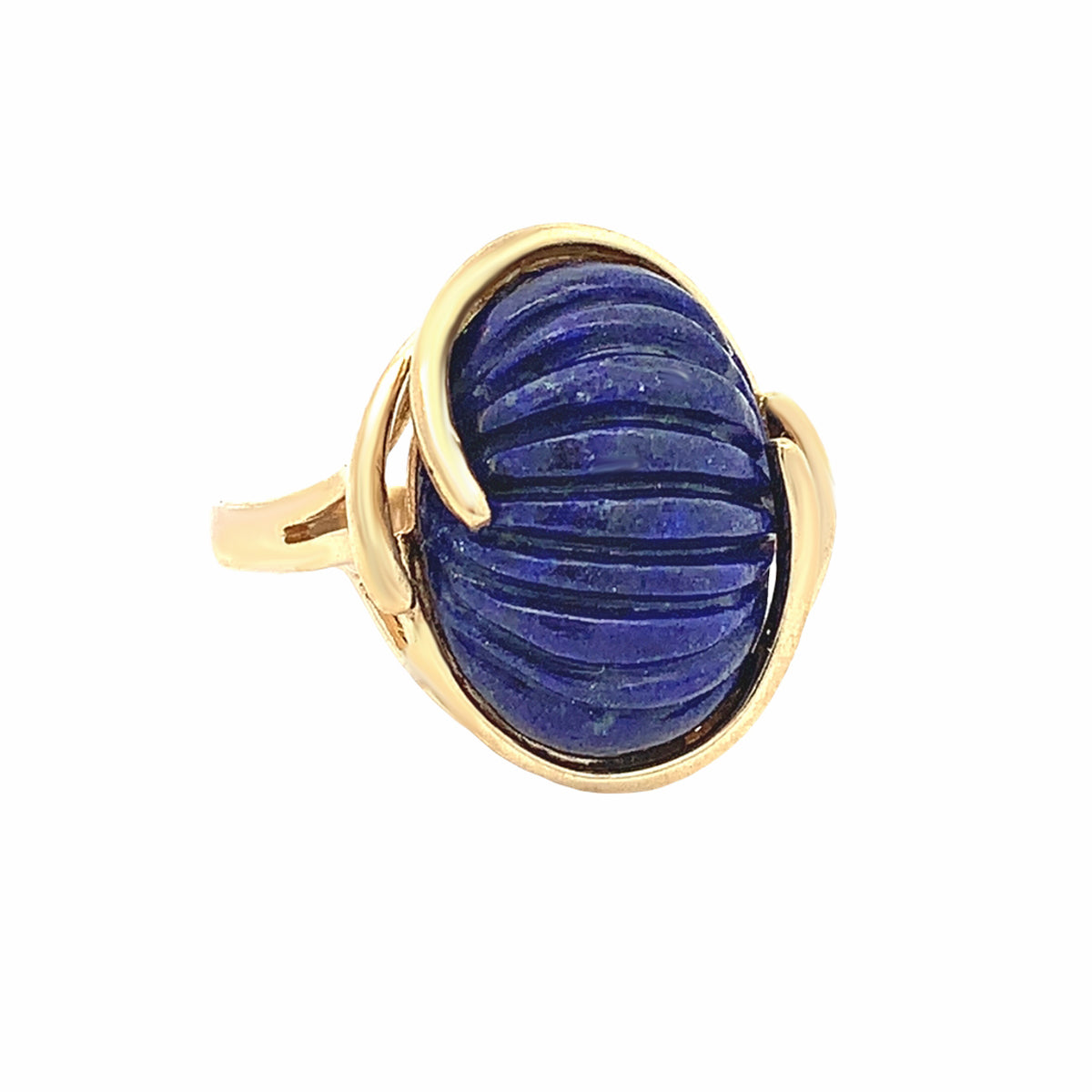 14kt yellow gold Vintage carved, ribbed lapis ring with swirled frame, size 6.5