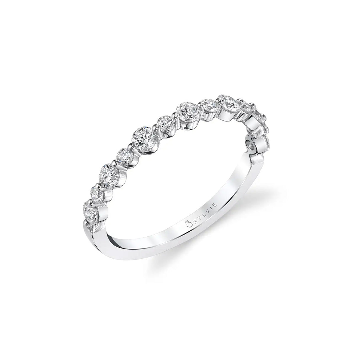 14k white gold .51ct diamond 1-prong wedding band alternating small/larger diamonds, size 6.5