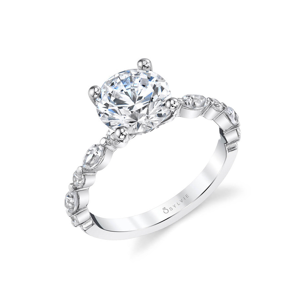 14k white gold ring mounting with 0.38ct marquise diamond 1-prong shank and 2ct head, Size 6.5 (center stone not included)
