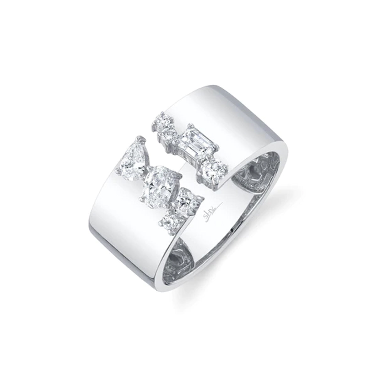 14k white gold wide split-top fashion ring with 0.61ct pear, oval, emerald-cut and round diamonds, Size 7