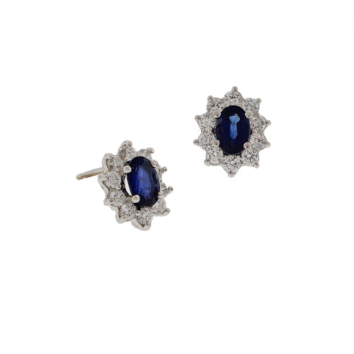18KW GOLD STUD EARRINGS 1.28CT OVAL SAPPHIRES & 0.78CT DIAMOND HALO