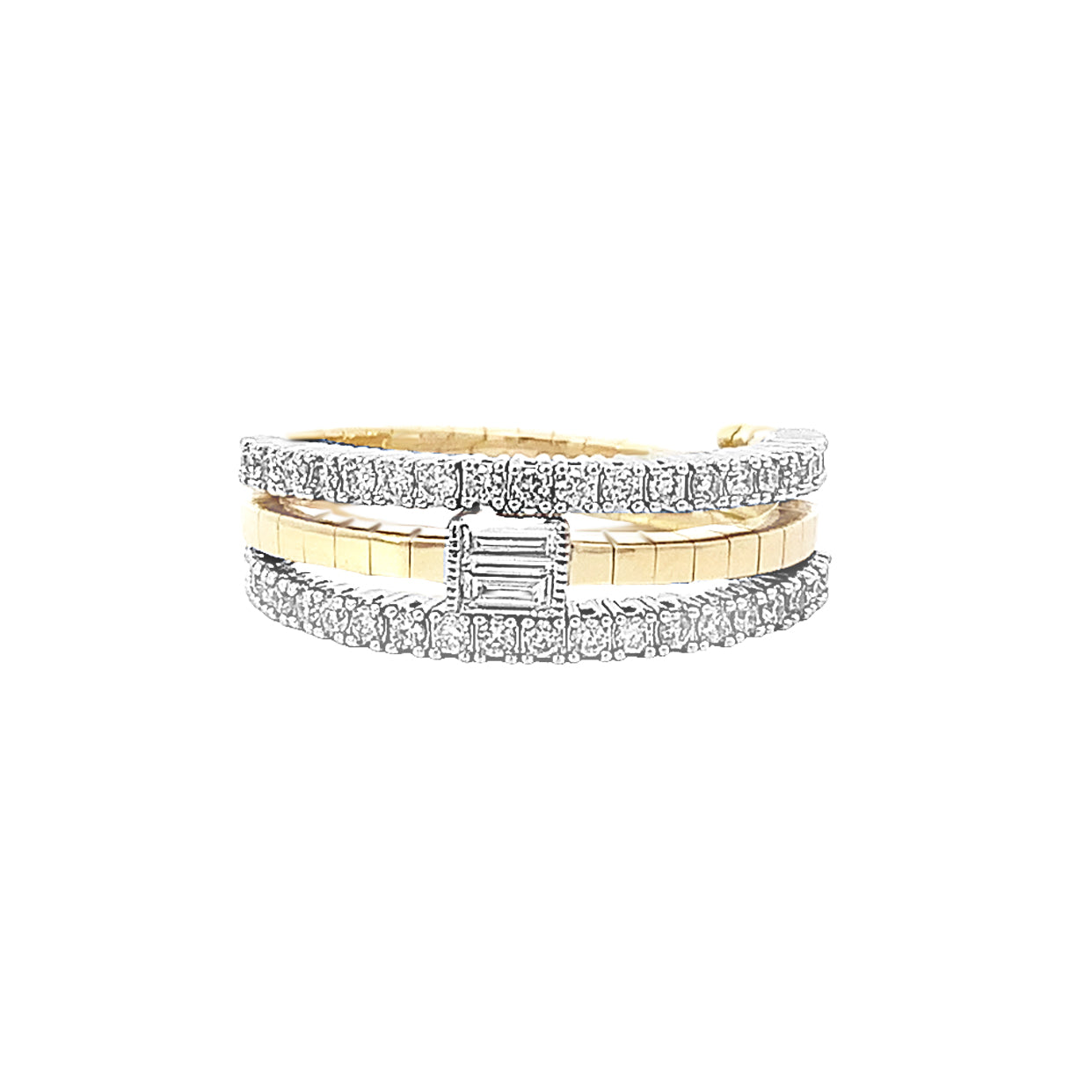 14k yellow gold .37ct diamond 3-row coiled flex ring with baguette center (Titanium core for flexibility), Size 7
