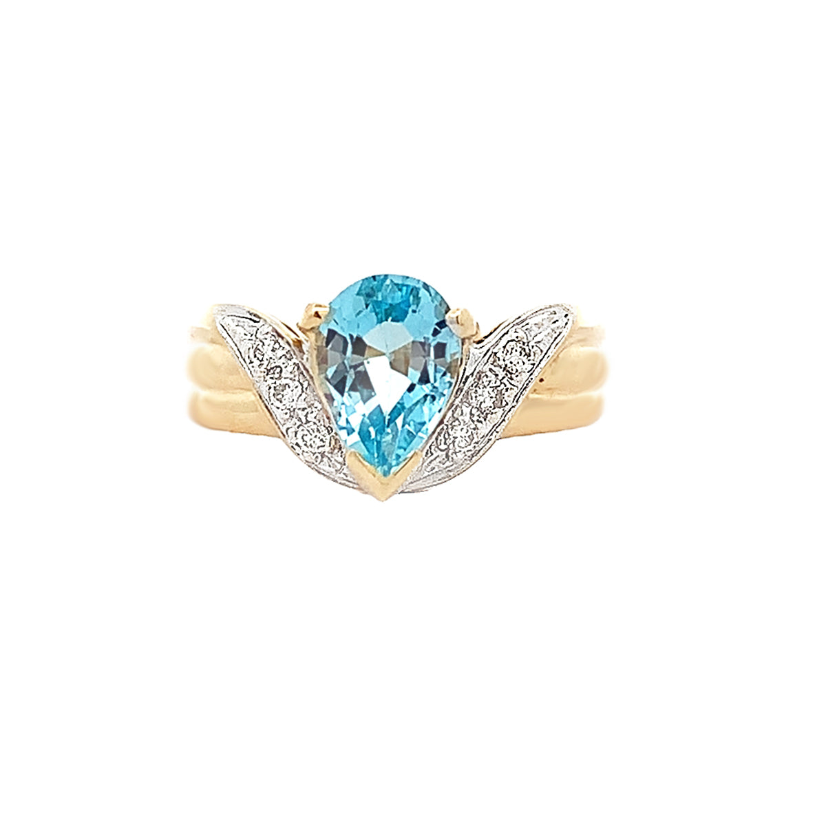 10k yellow gold Vintage pear blue topaz & 0.05ct diamond "V" ring, size 6