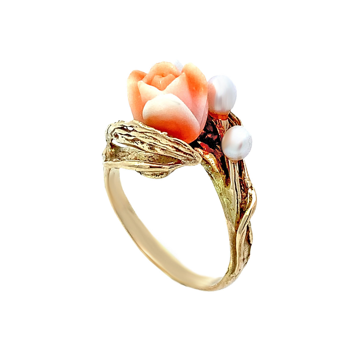 14kt yellow gold carved coral "rose" ring with leaf & pearl design, size 5.75