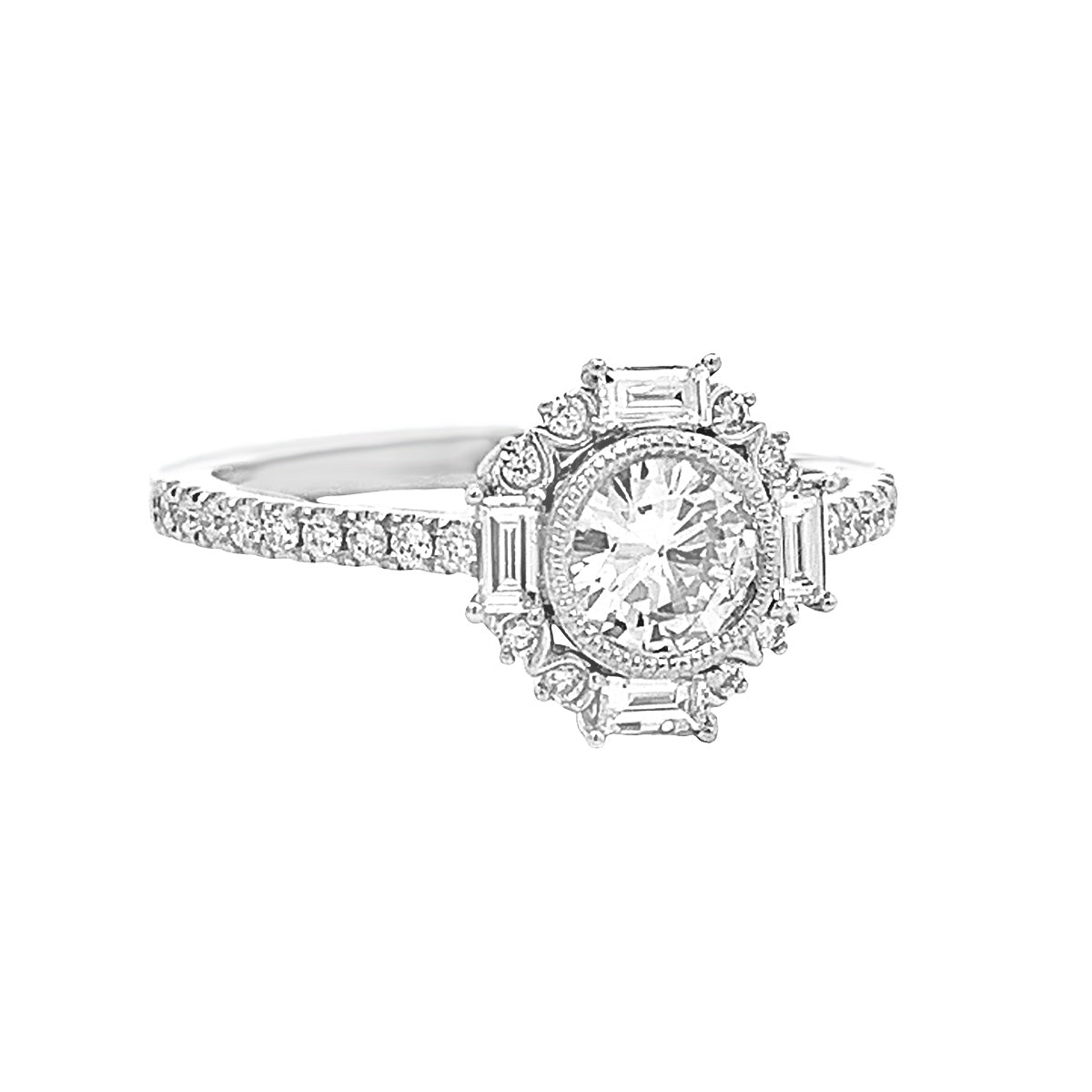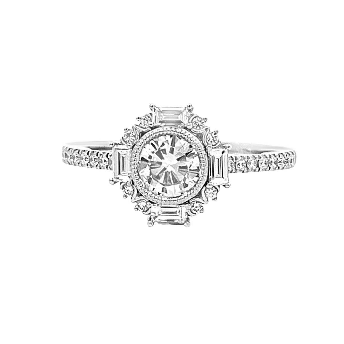 14kt white gold Modern Deco-inspired 0.82ct round & baguette diamond Fashion ring, size 6.5. A Modern interpretation of 1920s-1930s jewelry fashion. Center diamond is GIA certified.