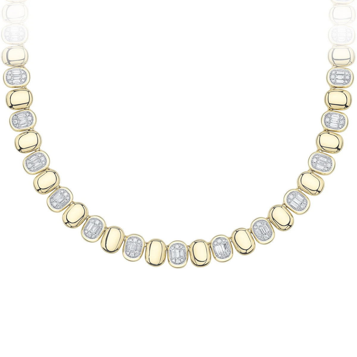 14k yellow gold 17" fabulous pillow link "Icon Lumeria" necklace by Shy Creation with 1.70ct baguette & round diamonds in 17 stations