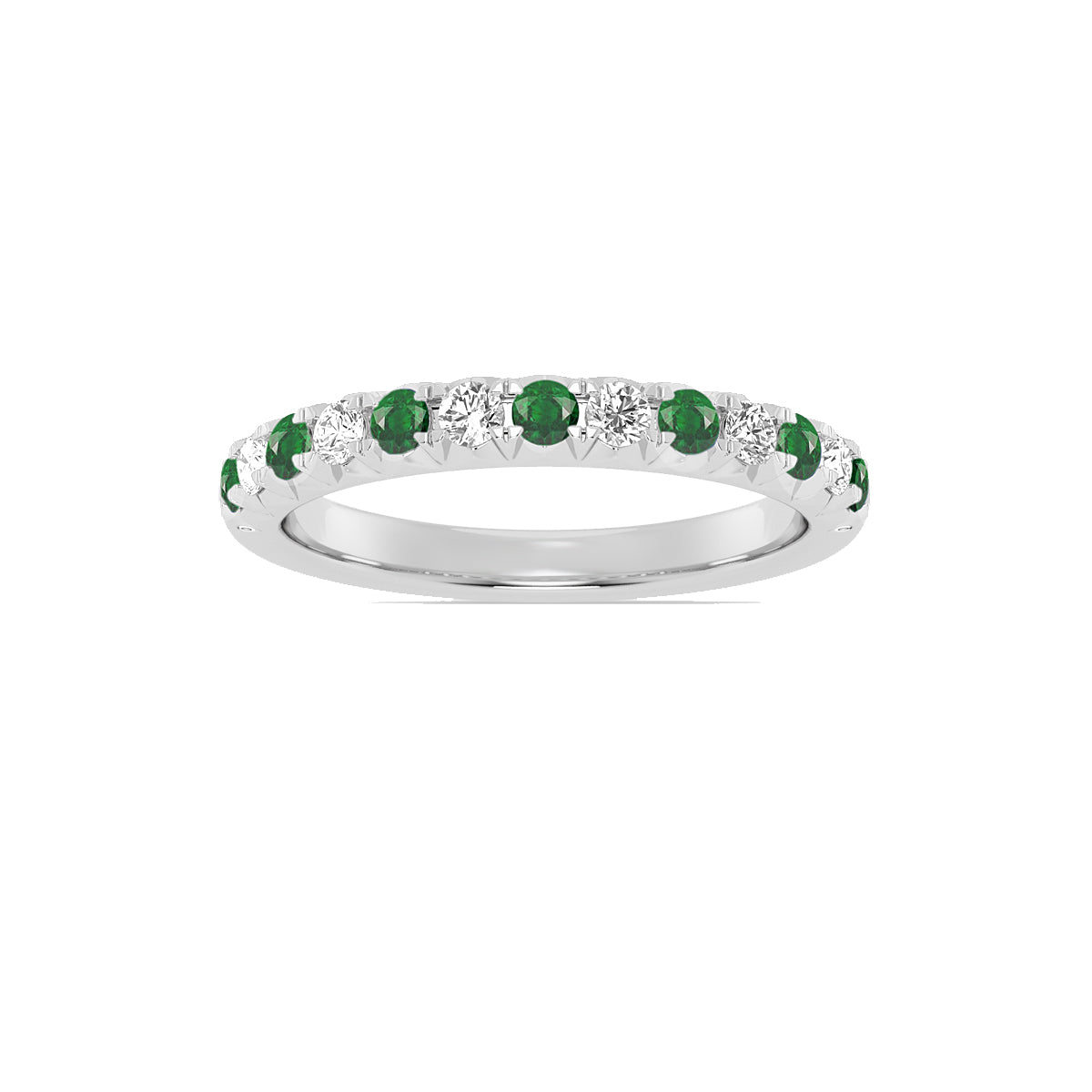 14kt white gold 2.2mm emerald & 0.25ct diamond fishtail band, size 6. A stackable band for the green gemstone lover, or to commemorate a May birthday.