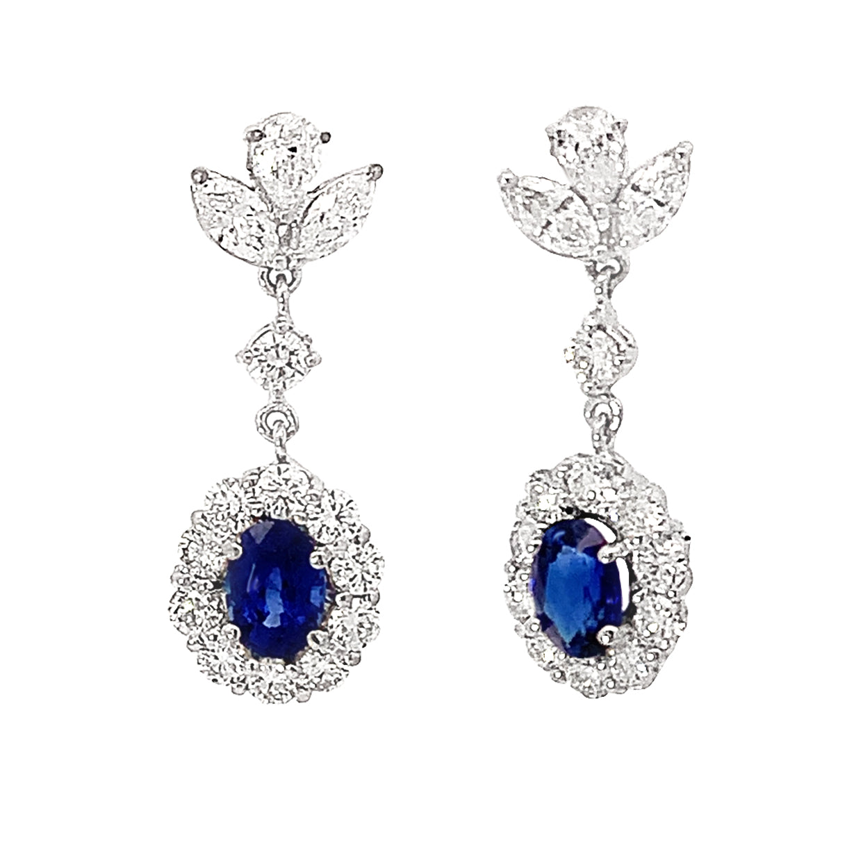 18k white gold 2.40ct fine sapphire and 3.28ct round, pear and marquise diamond drop earrings