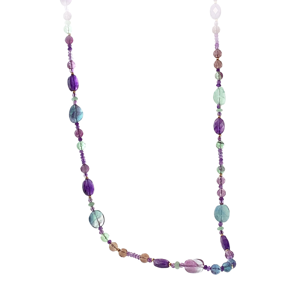 Colorful 14kt yellow gold 40" Vintage seasonal color bead necklace by Zoe B. with amethyst, flourite & smoky quartz