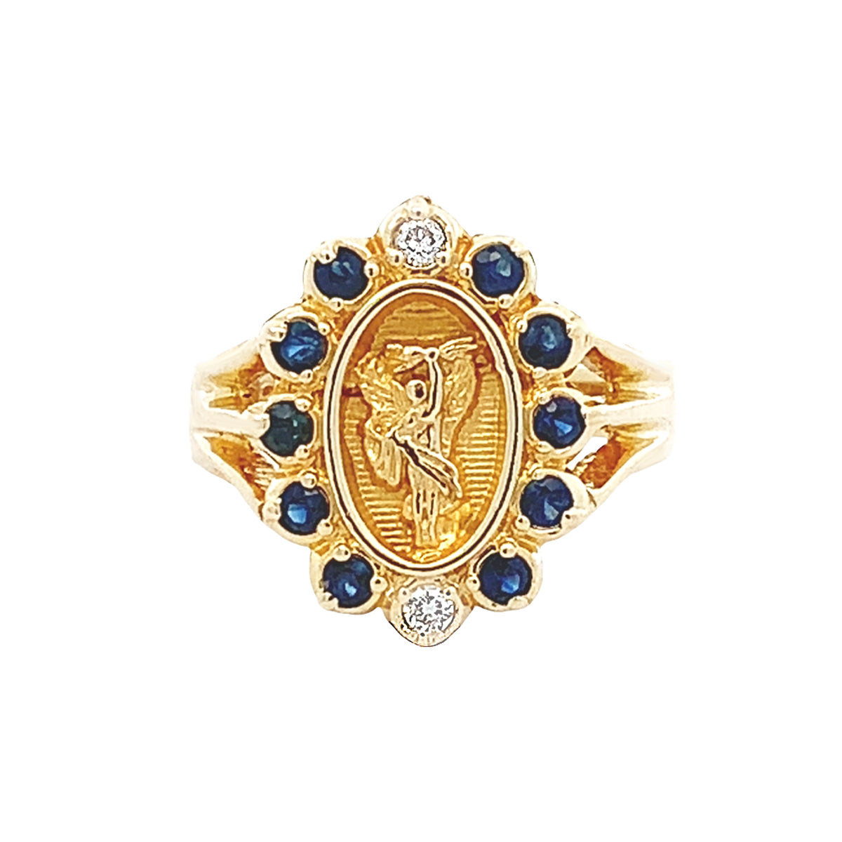 14ky Vintage gold cameo ring with sapphires & 0.05ct diamonds, size 6.75