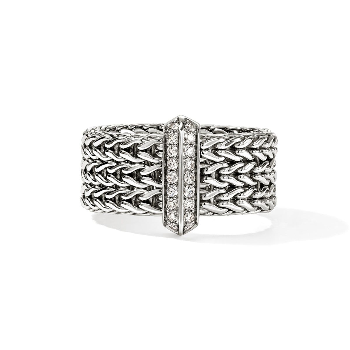 Sterling silver John Hardy 9mm 3-Row Classic Chain band ring with 0.21ct pave diamond center, Size 7