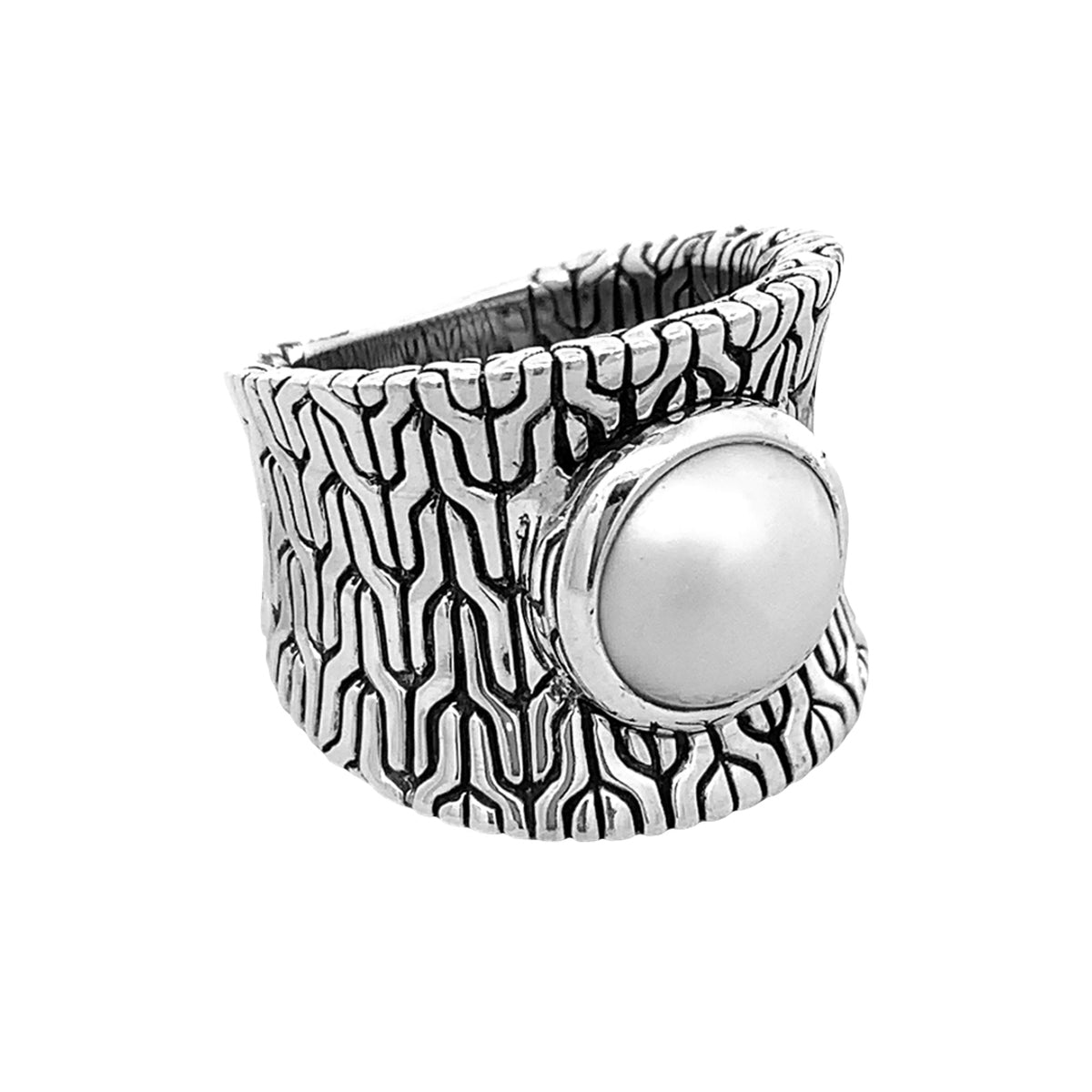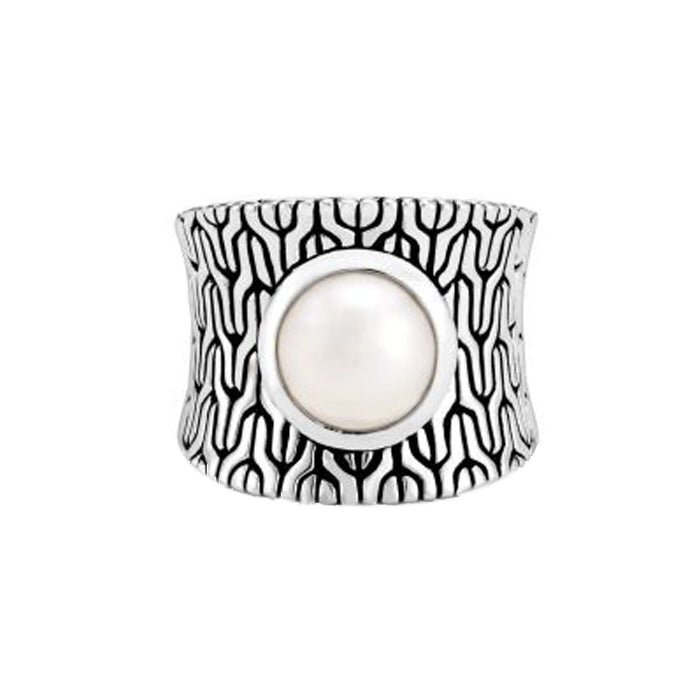 Sterling silver Vintage John Hardy wide concave mabe pearl "Saddle" statement ring, size 7. The ring's texture mimics the classic Balinese woven chain that John Hardy is known for.